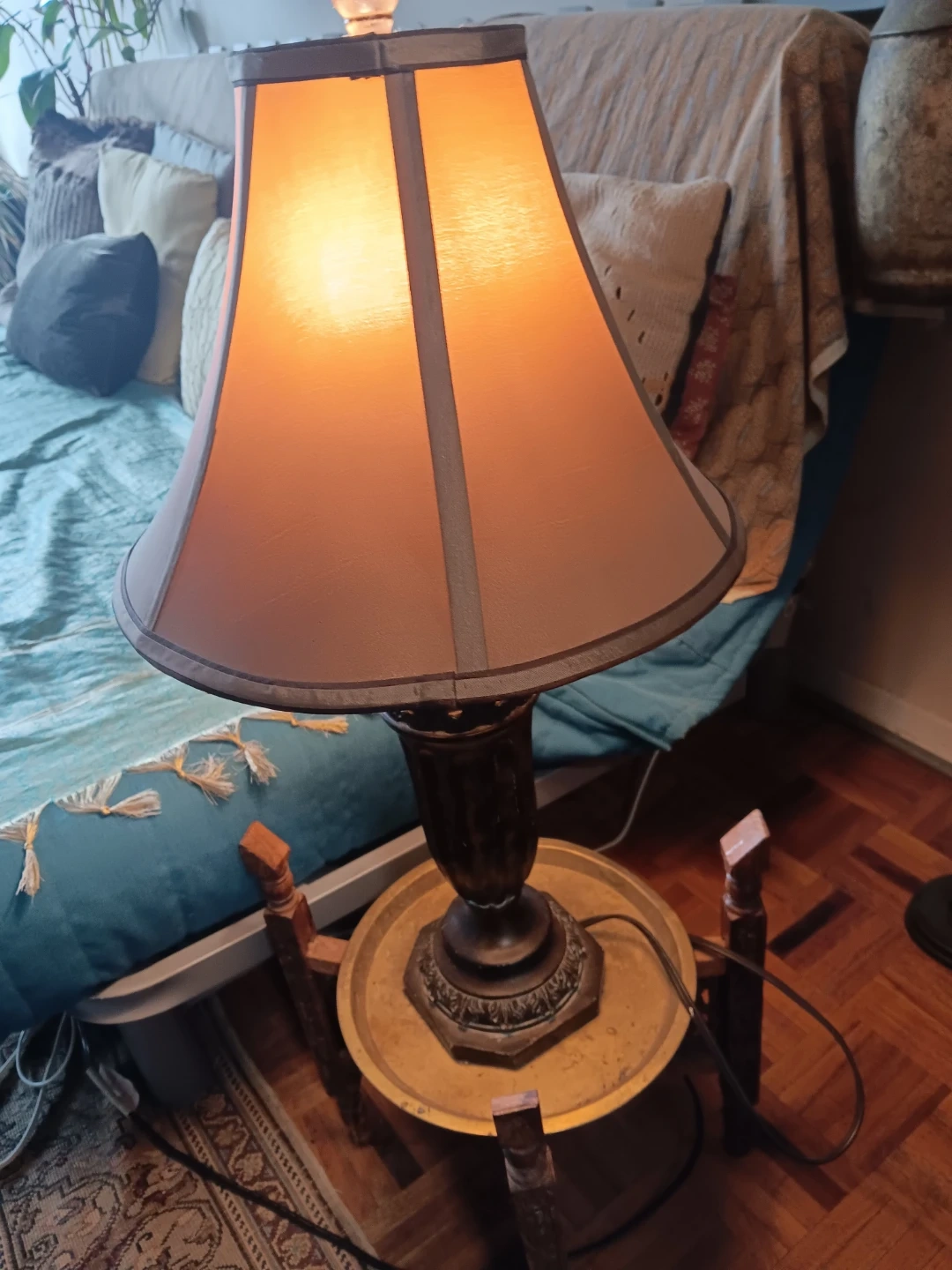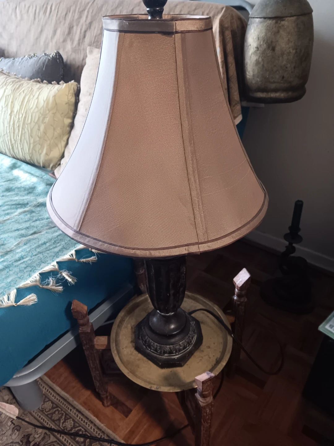Selling a charming table lamp with a classic shade. It's in great condition and would look lovely in any room. The lamp has a decorative base and comes with a lampshade.
