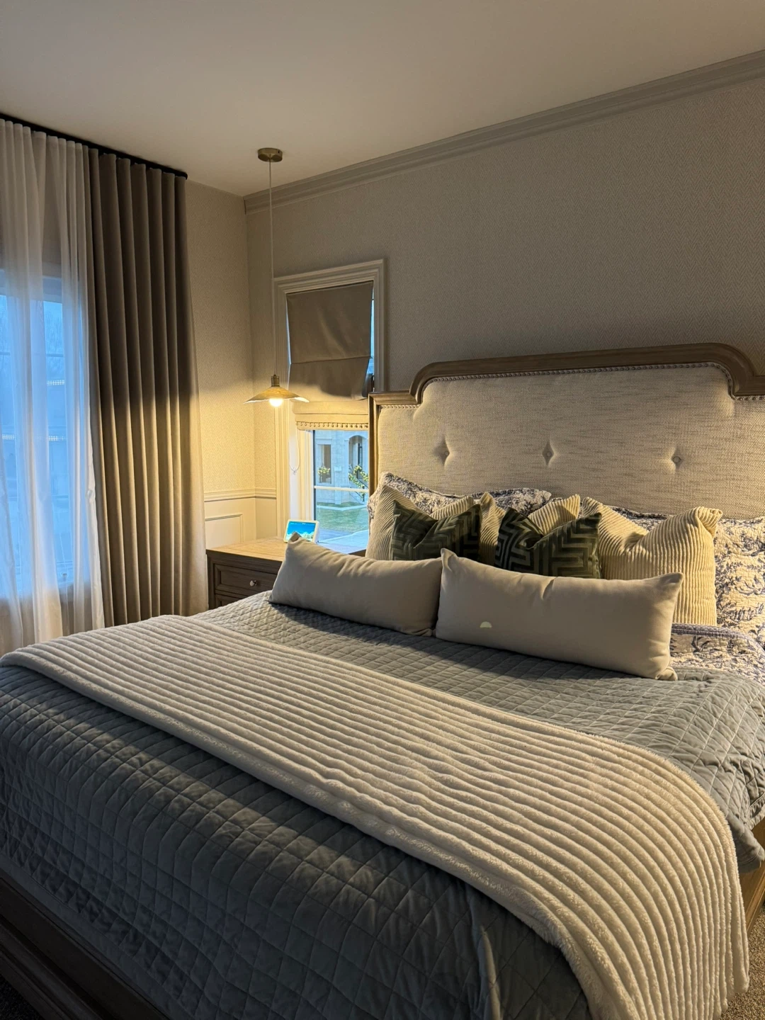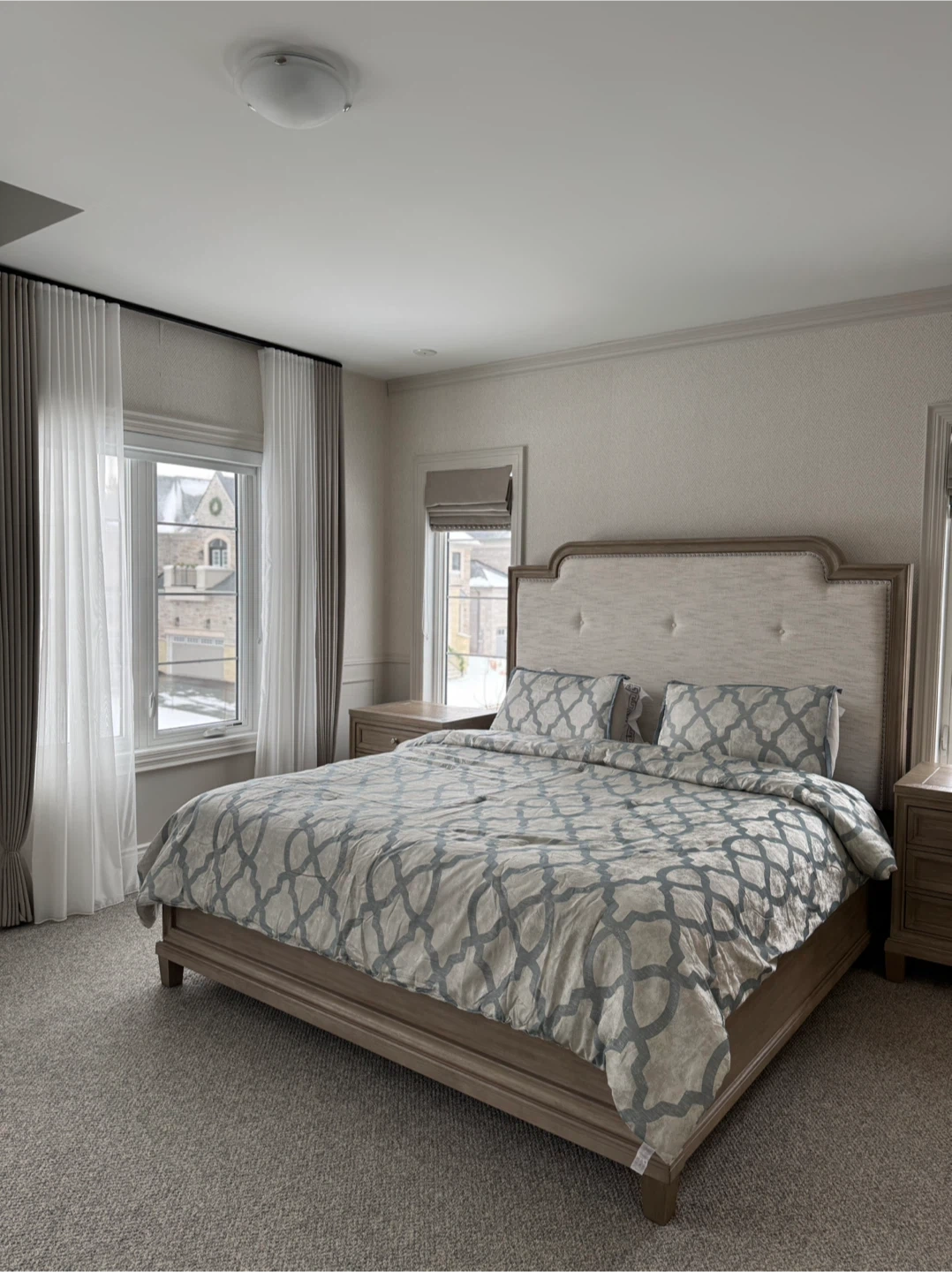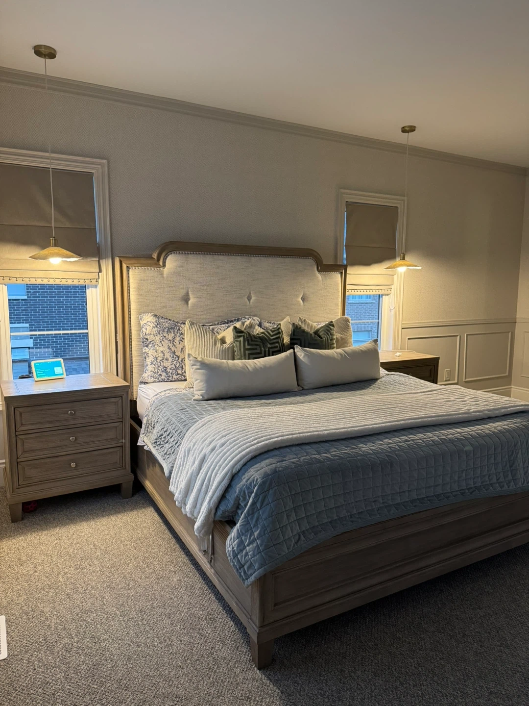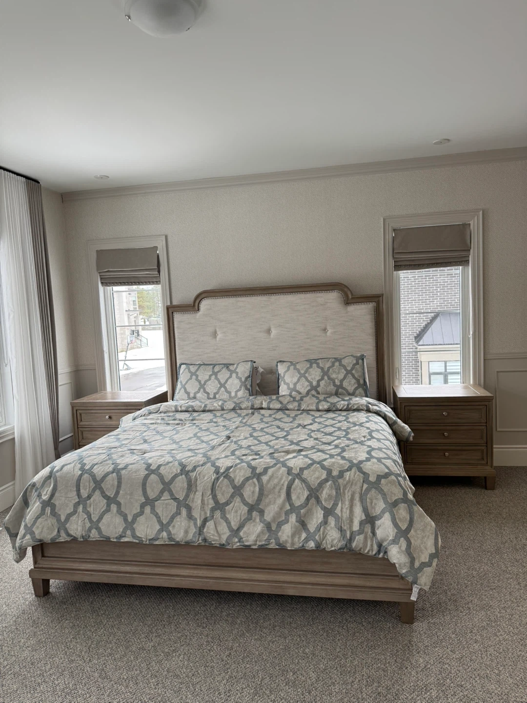 Stylish king-size bed frame with tufted upholstered headboard and matching wooden nightstands. Bed has light-toned wood finish. Two three-drawer nightstands two matching armchairs, barcart and a middle end table included