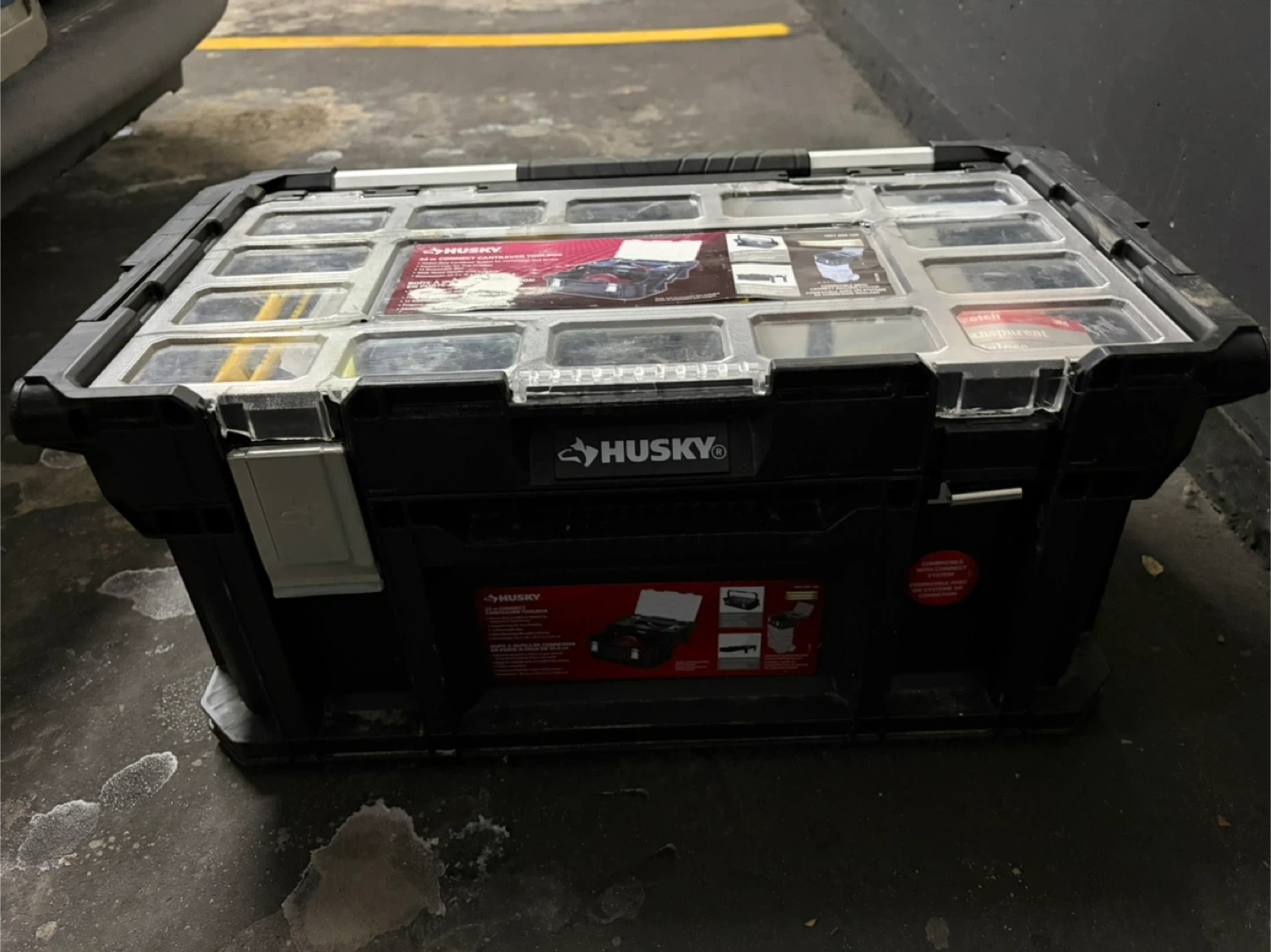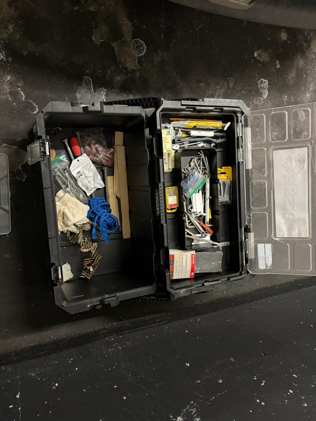 Husky tool box filled with various tools and hardware. Includes screwdrivers, pliers, scissors, tape, and many other useful items. Great for home repairs or DIY projects! Husky Tool Box with lots of miscellaneous items