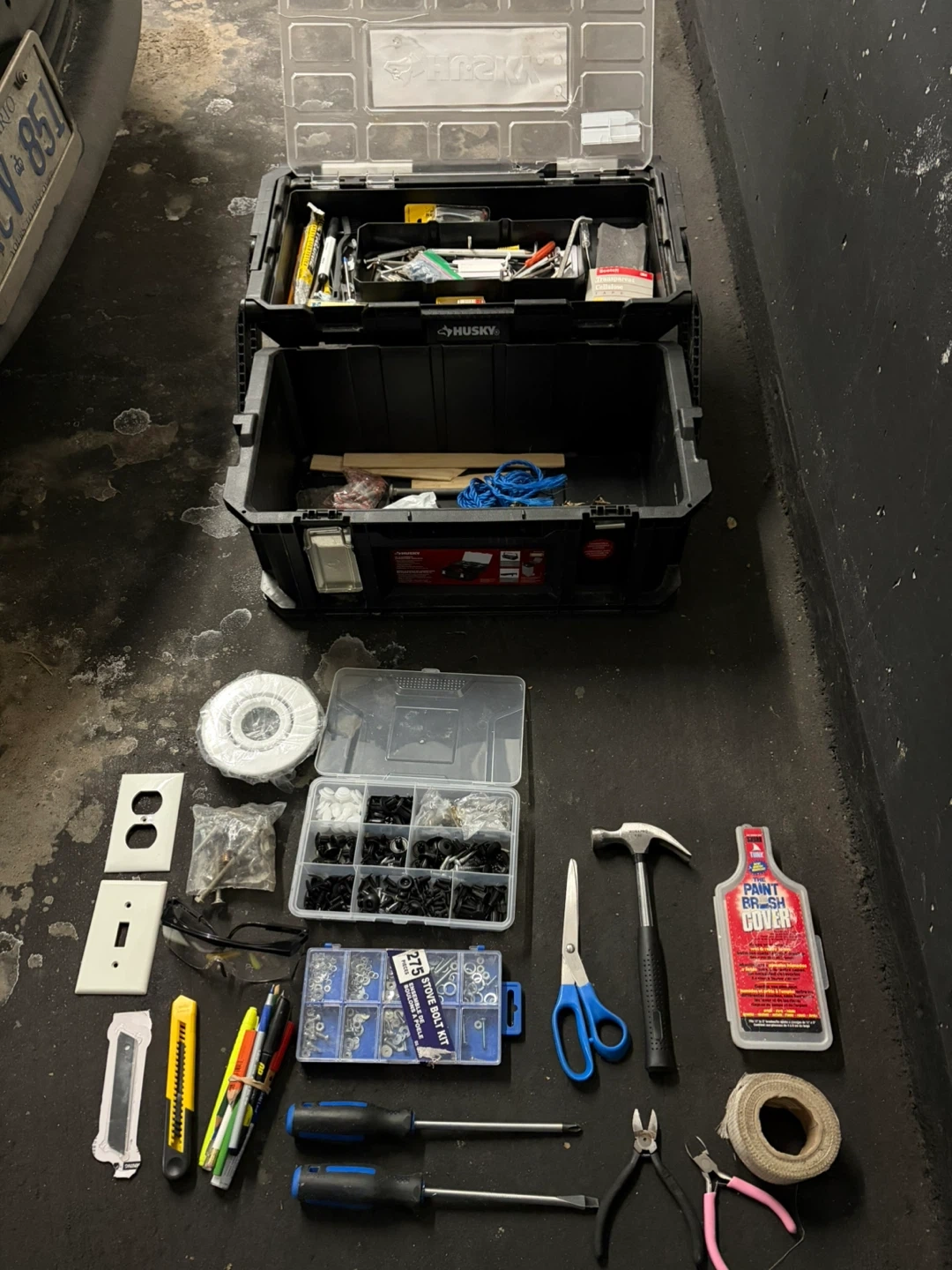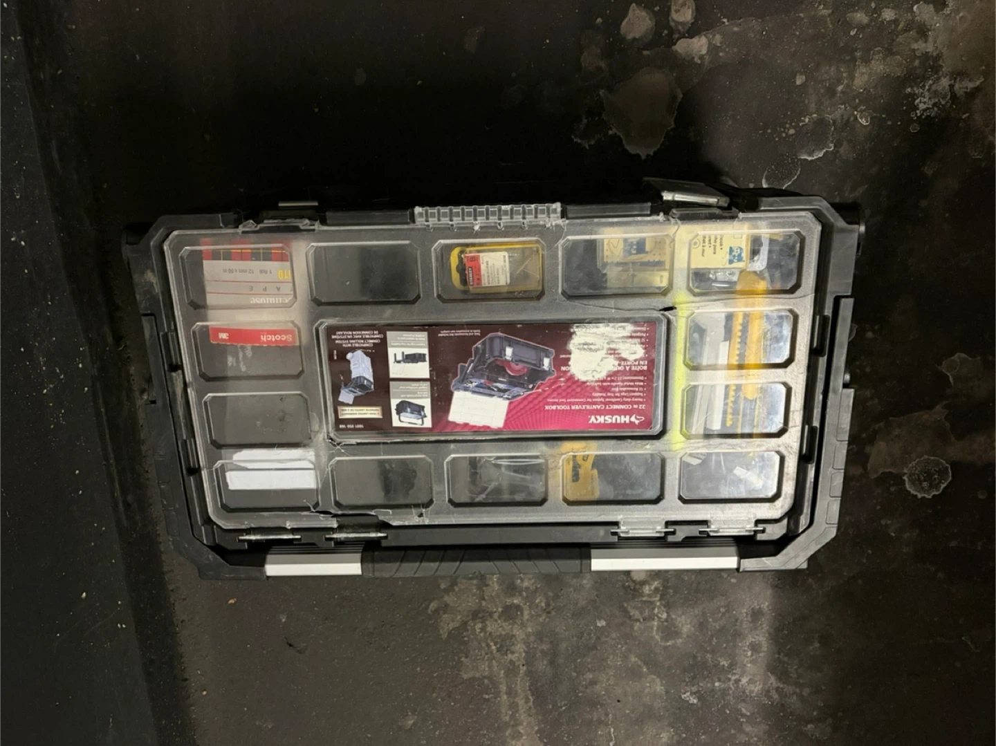 Husky tool box filled with various tools and hardware. Includes screwdrivers, pliers, scissors, tape, and many other useful items. Great for home repairs or DIY projects! Husky Tool Box with lots of miscellaneous items