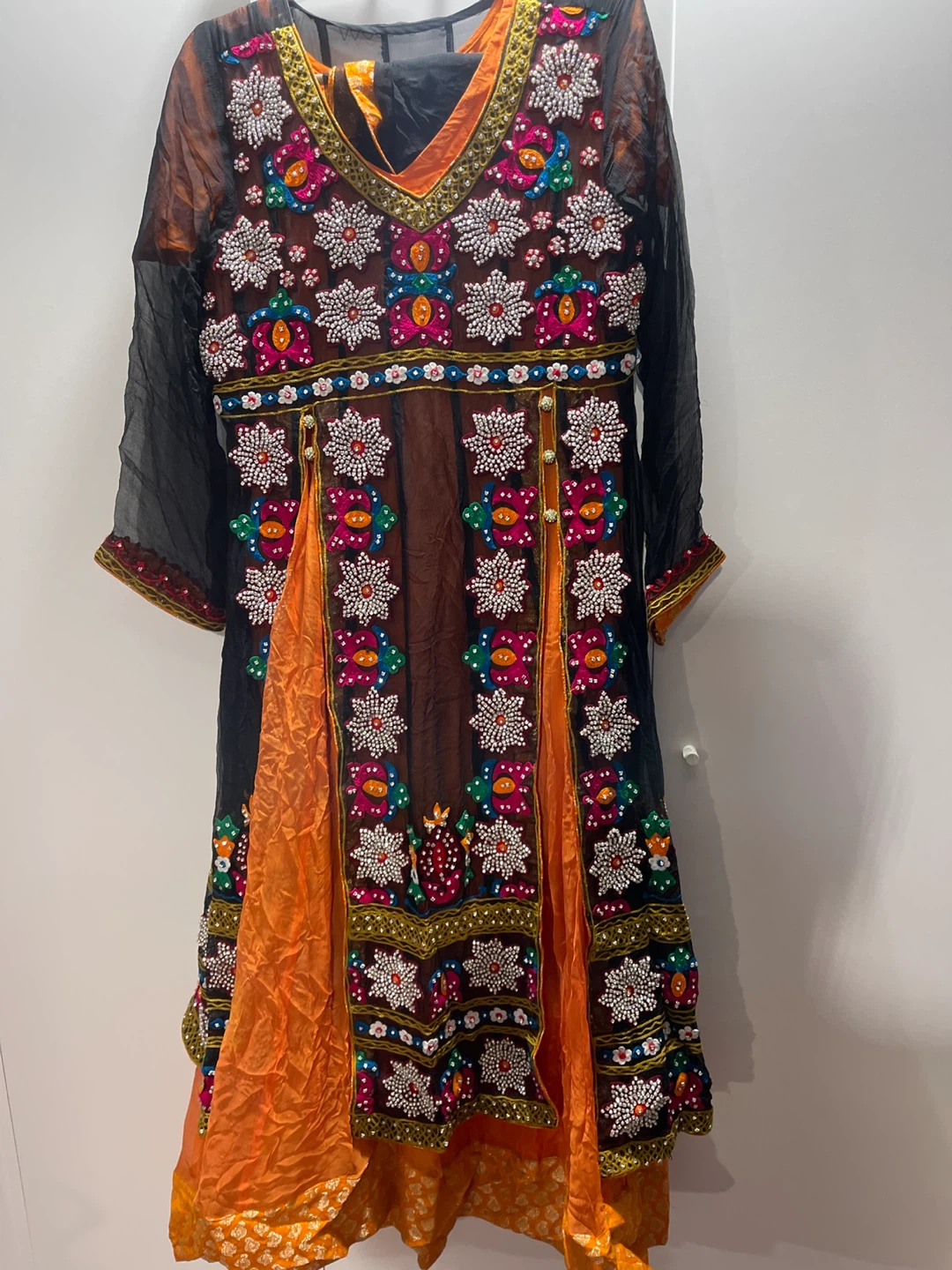 Beautiful embroidered dress with intricate detailing in orange, black, and other vibrant colours. Perfect for a special occasion or adding a unique touch to your wardrobe!