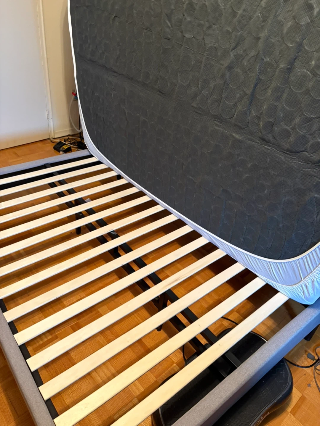 This is a grey upholstered bed frame with wooden slats. It's designed for durability and support. The frame measures full size.