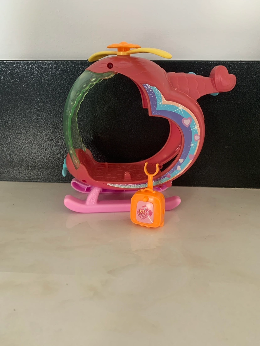 My little pony Helicopter This is a pink and orange helicopter with a suitcase accessory.