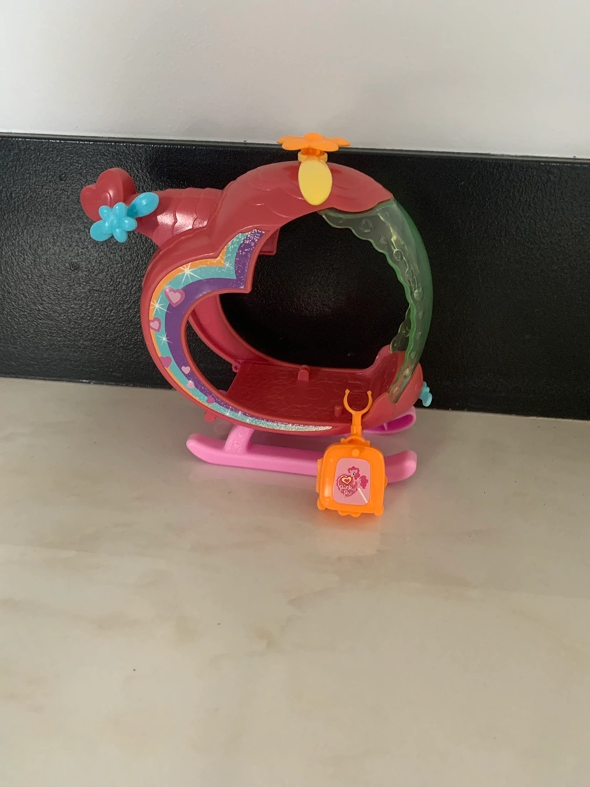 My little pony Helicopter This is a pink and orange helicopter with a suitcase accessory.