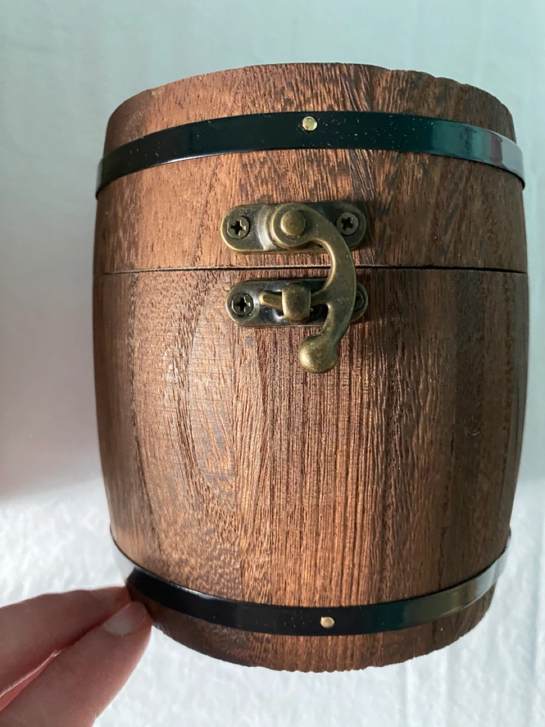 This is a unique glassware set featuring a glass with "1964 Vintage Limited Edition" printed on it. It comes presented in a decorative wooden barrel-shaped display box with metal accents and a clasp closure. The glass is protected inside the foam-lined barrel.