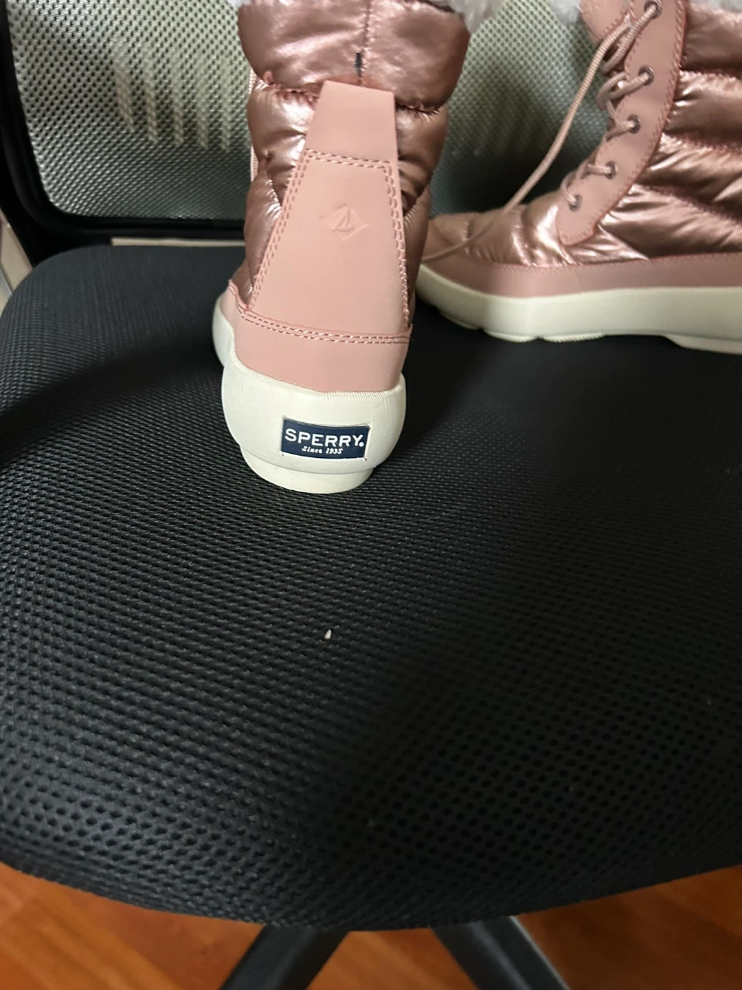 These Sperry winter boots are a lovely rose gold color and feature a cozy faux fur lining. They have a lace-up closure for a secure fit and a durable sole. Perfect for keeping your feet warm and dry during cold weather!