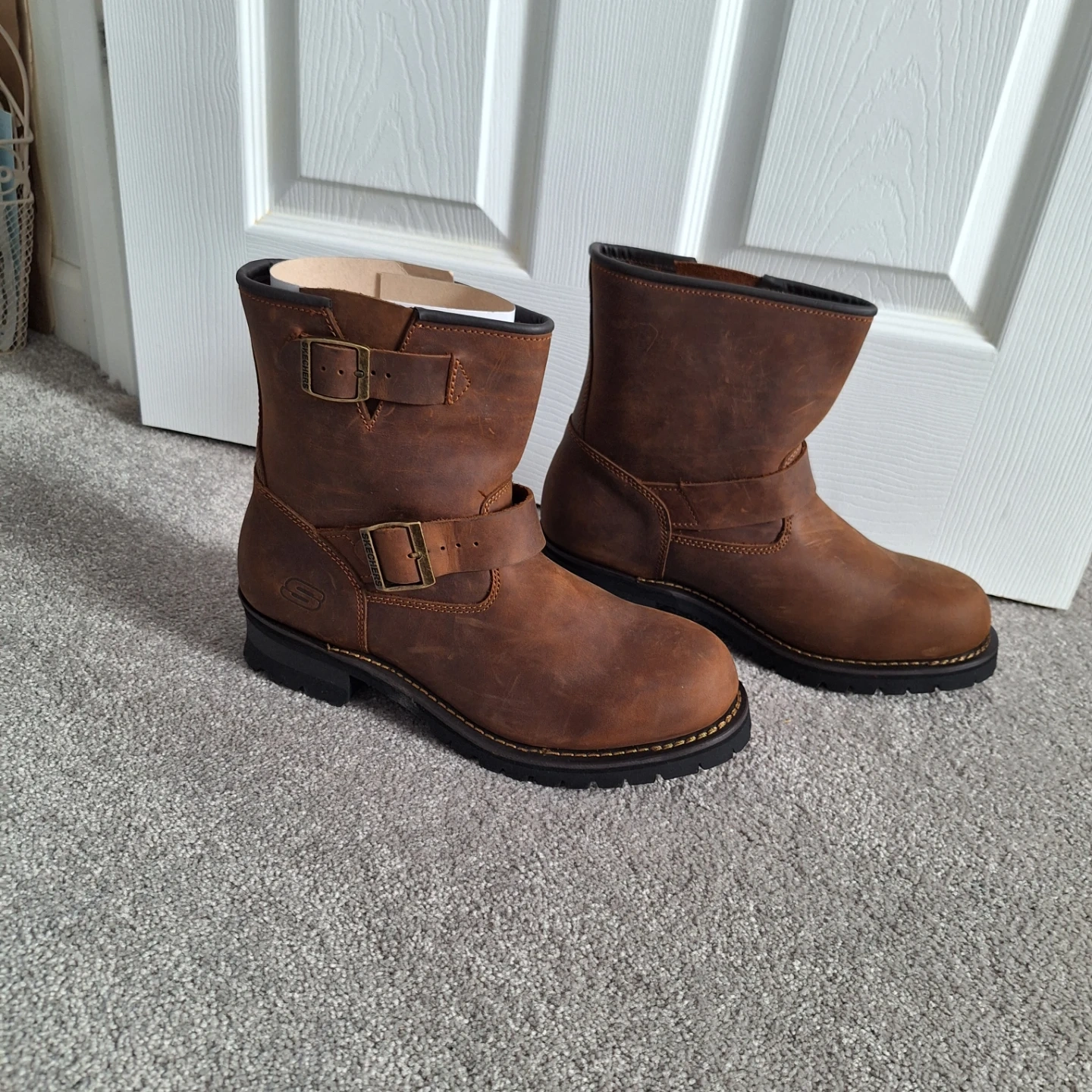 Brown leather motorcycle boots from Skechers Utility Footwear. These boots come in a size 11.5 and feature a durable rugged outsole. Includes the original box.