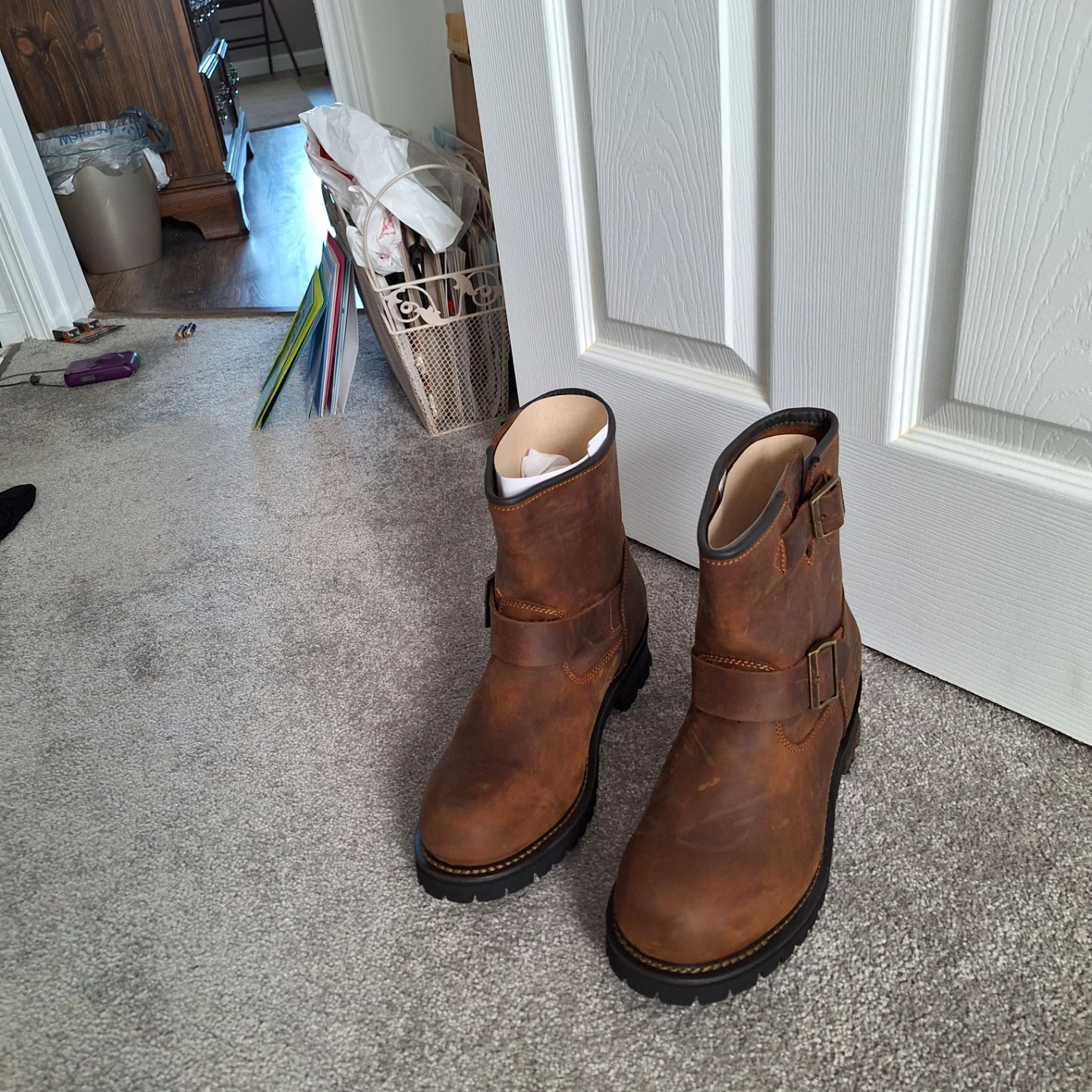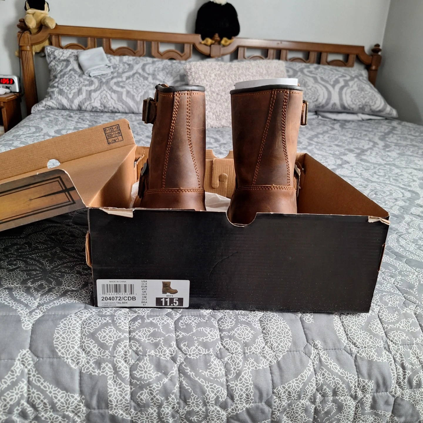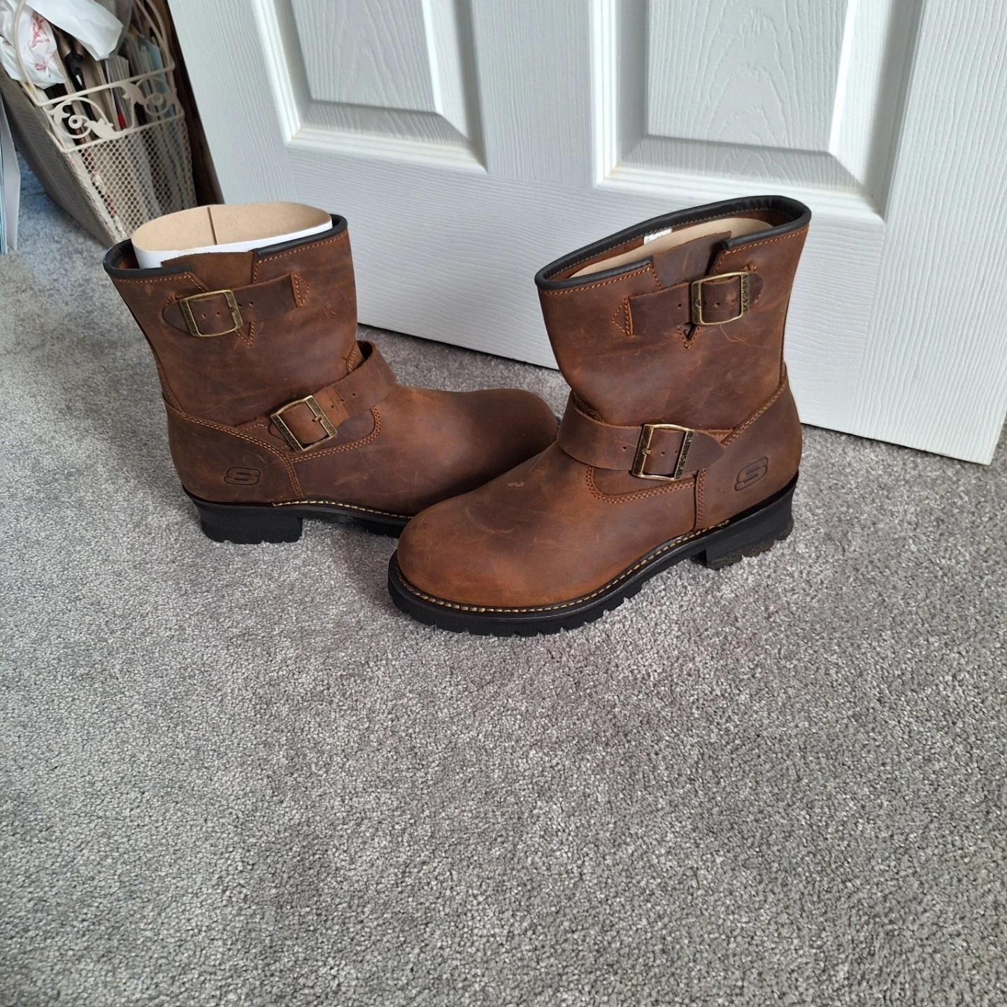 Brown leather motorcycle boots from Skechers Utility Footwear. These boots come in a size 11.5 and feature a durable rugged outsole. Includes the original box.
