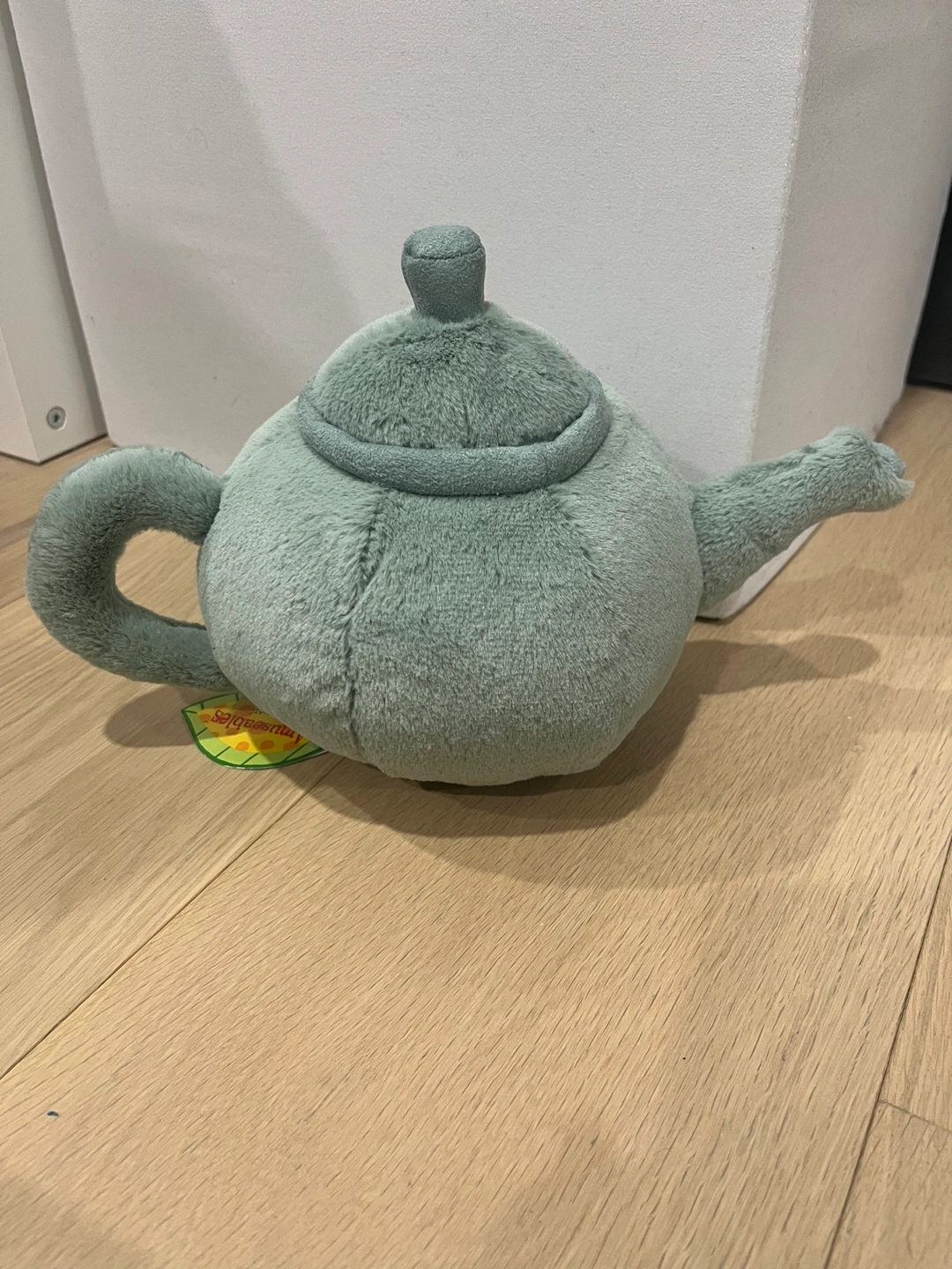 retired jellycat. Super cute sage green teapot plush. Small size, perfect for cuddling. Soft and cuddly material. Great gift for tea lovers.