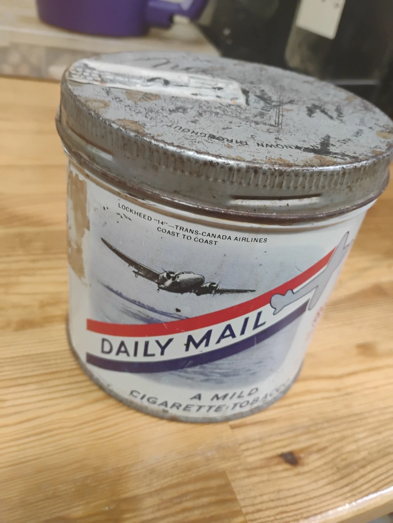 Selling a vintage Daily Mail cigarette tobacco tin. It features a Lockheed "14" Trans-Canada Airlines Coast to Coast airplane design. A cool piece of memorabilia!