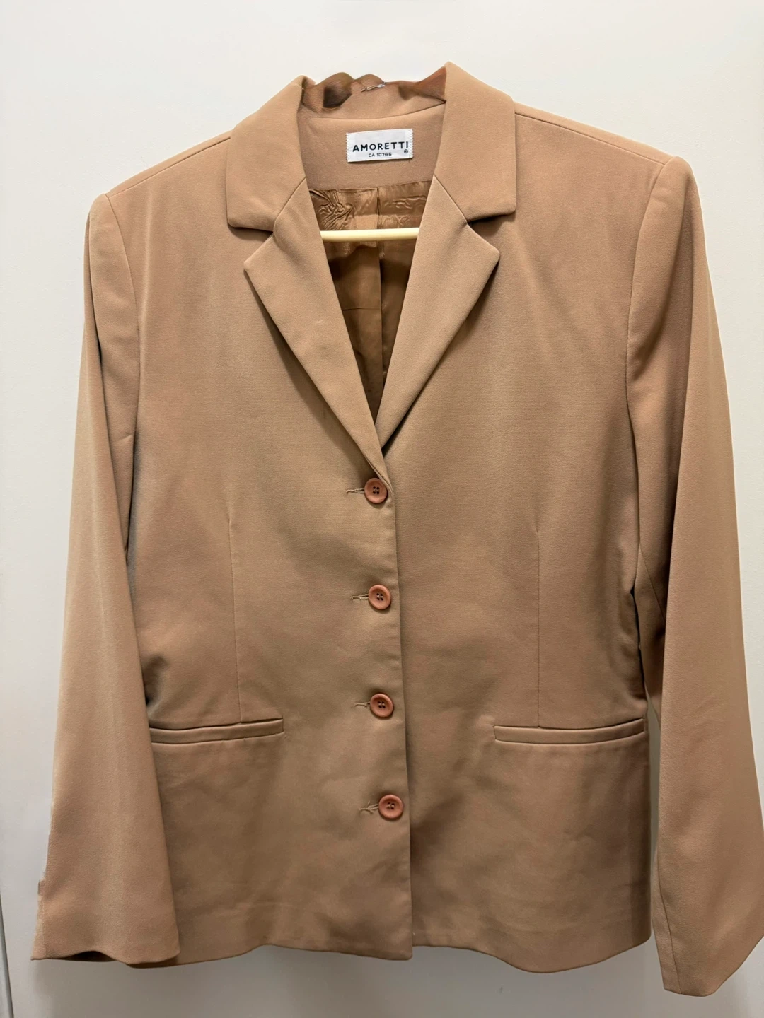 This is an AMORETTI blazer in a lovely tan colour. It's a classic single-breasted style with three buttons. The lining is a smooth satin-like material.