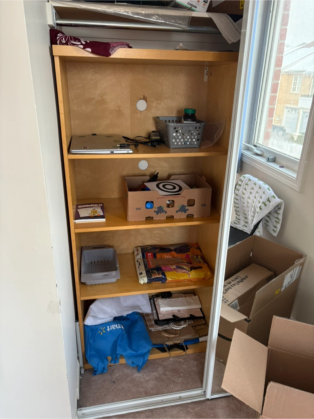 This is a 4-shelf wooden bookshelf. It has a hole in the back for cable management. It's suitable for organizing books or clothes or displaying items