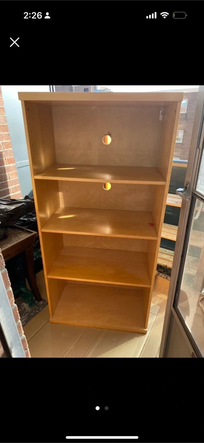 This is a 4-shelf wooden bookshelf. It has a hole in the back for cable management. It's suitable for organizing books or clothes or displaying items