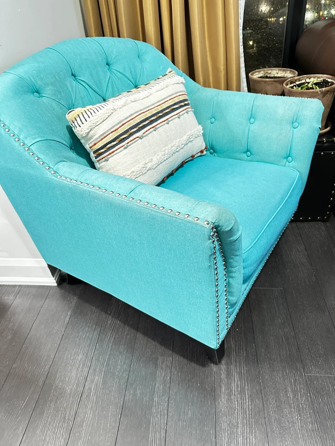 Turquoise accent chair in great condition! It's a stylish addition to any room. The chair features a comfortable seat.Great for adding a pop of colour to your living space( pillow not included)