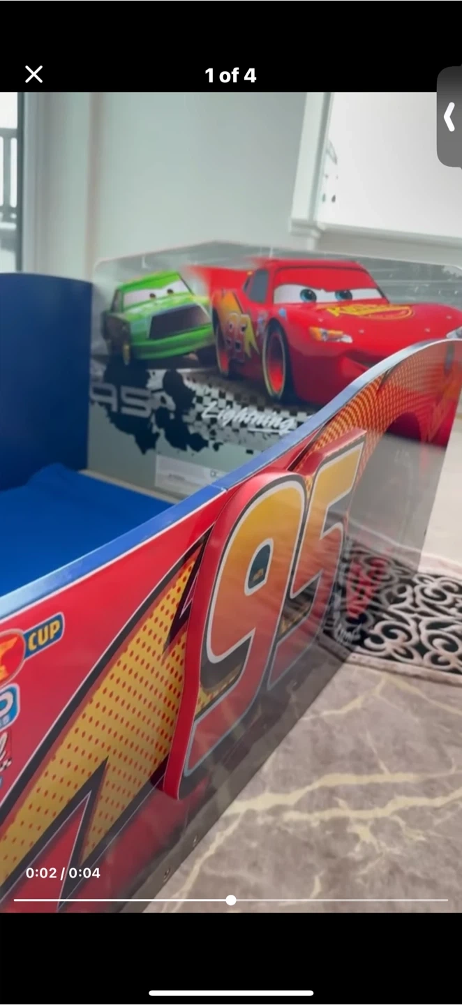 This fun toddler bed features Lightning McQueen and Mater from Disney's Cars. It's designed to make bedtime exciting for young fans. Sturdy construction ensures safety and durability for little ones.