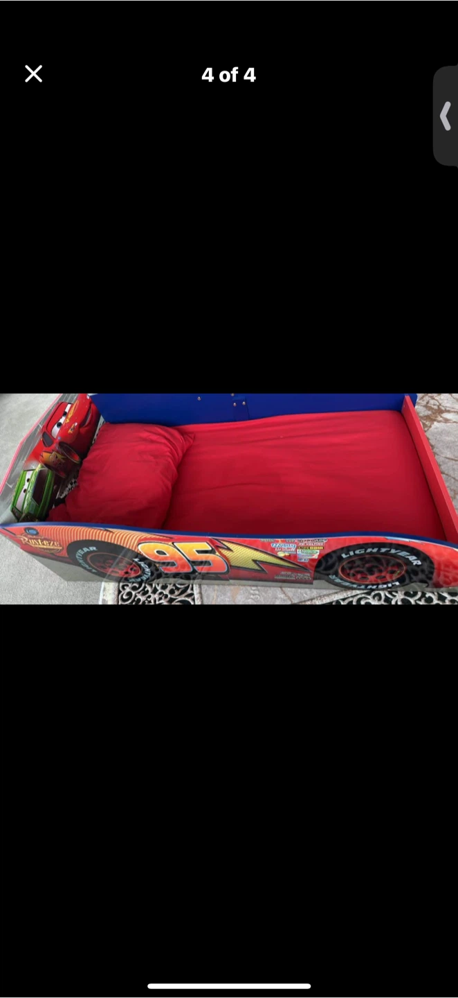 This fun toddler bed features Lightning McQueen and Mater from Disney's Cars. It's designed to make bedtime exciting for young fans. Sturdy construction ensures safety and durability for little ones.