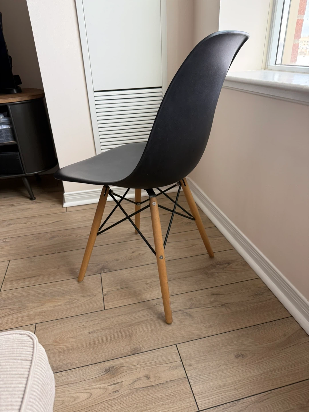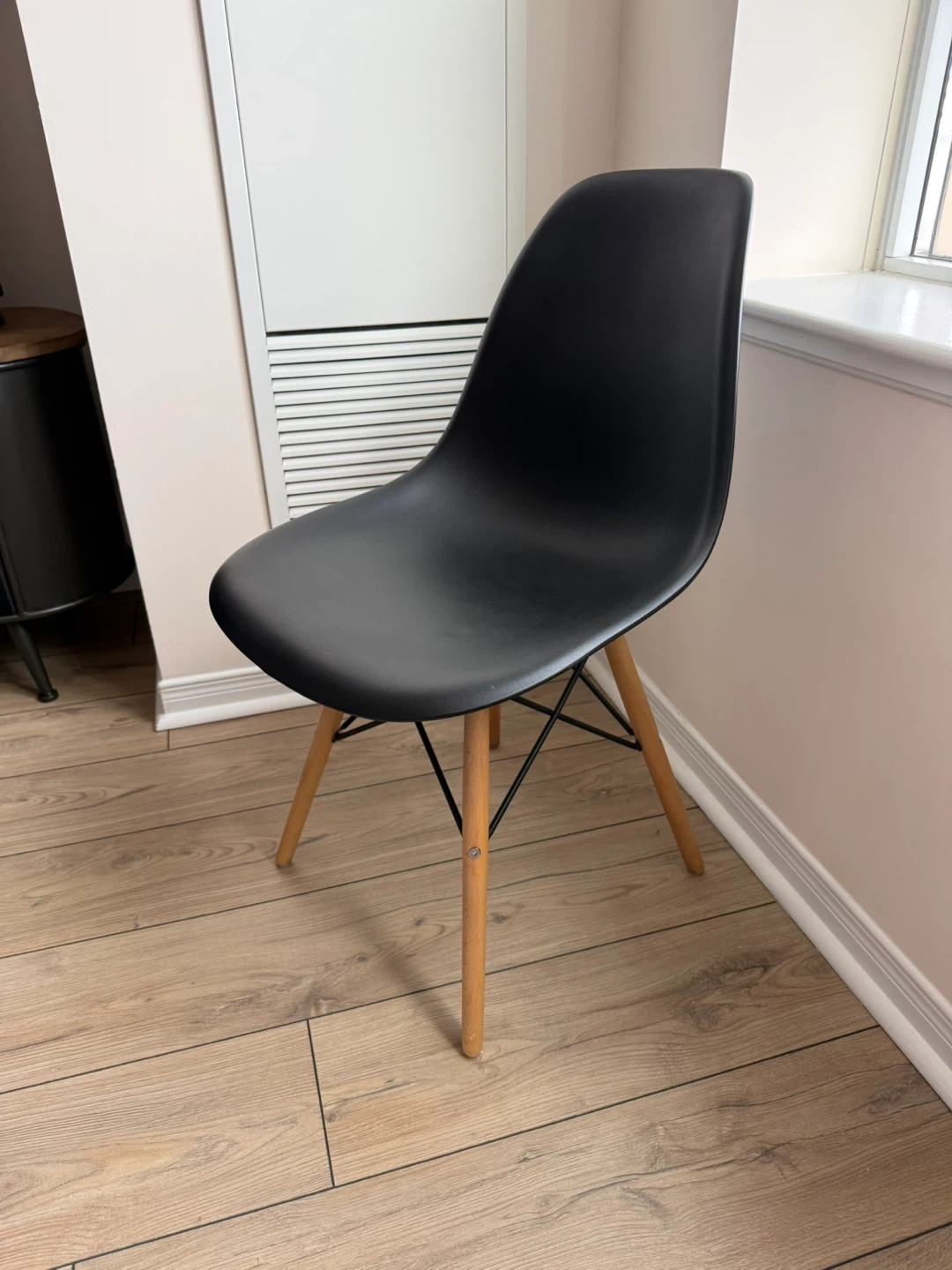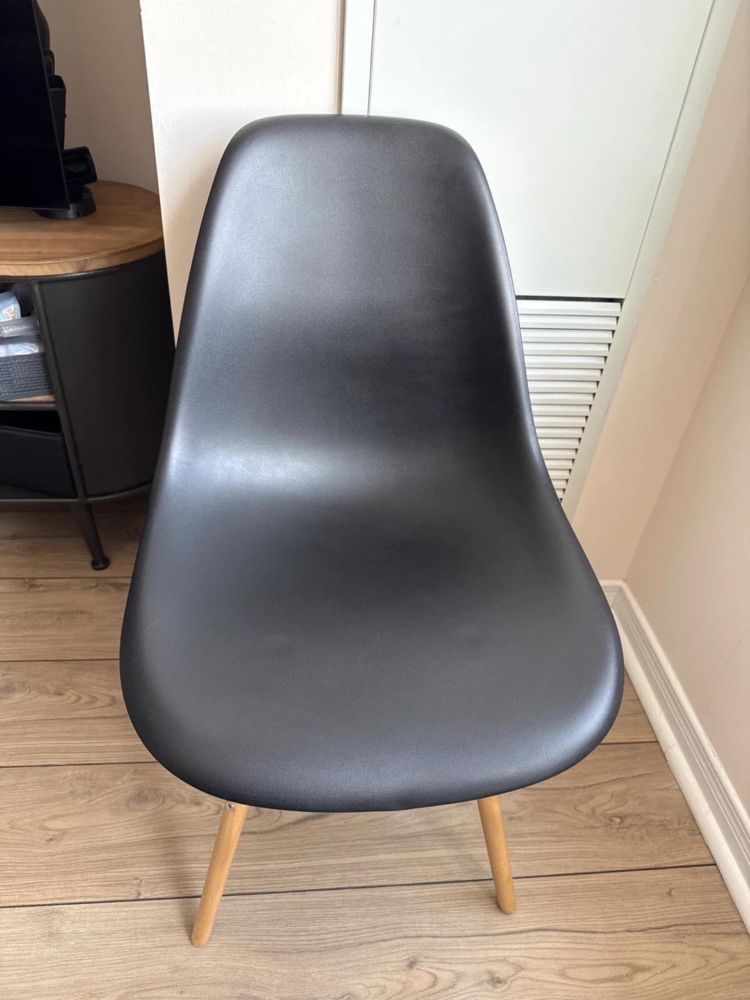 Set of 4 dining chairs. Black dining chair with a moulded seat and wooden dowel legs. It's a stylish and practical addition to any kitchen or dining area. The chair's modern design complements various decor styles.