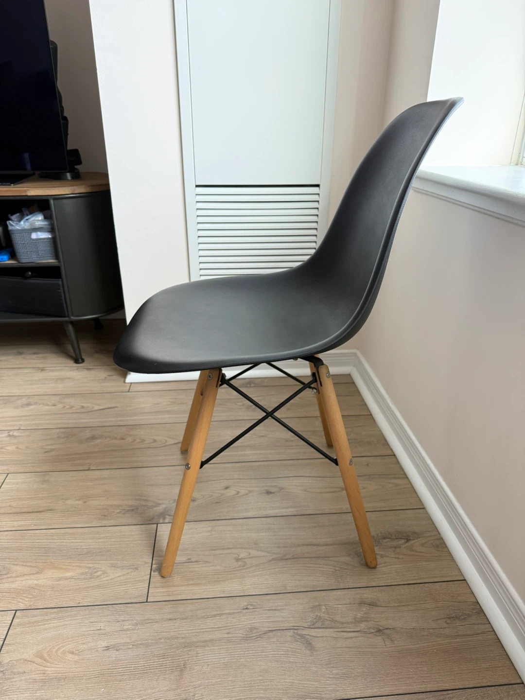 Set of 4 dining chairs. Black dining chair with a moulded seat and wooden dowel legs. It's a stylish and practical addition to any kitchen or dining area. The chair's modern design complements various decor styles.