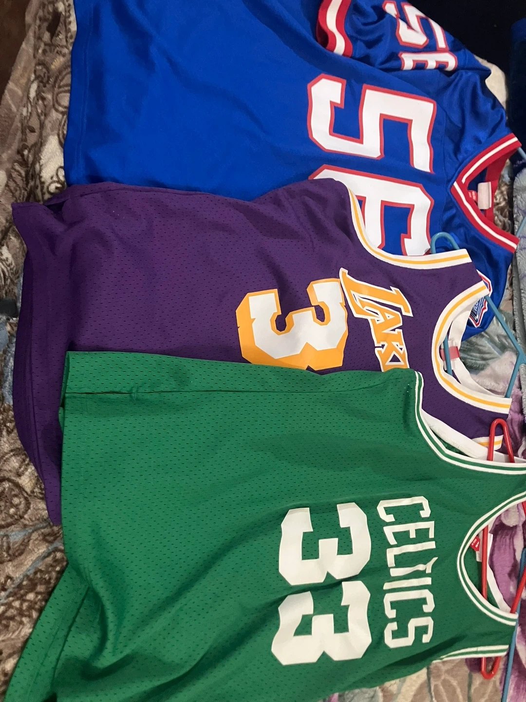 Get your hands on these classic NBA jerseys! This lot includes a purple Los Angeles Lakers #32 Magic Johnson jersey and a green Boston Celtics #33 Larry Bird jersey, both from Mitchell & Ness Hardwood Classics. Also included is a blue New York Giants #56 Lawrence Taylor Throwback jersey. Perfect for any basketball or football fan's collection!