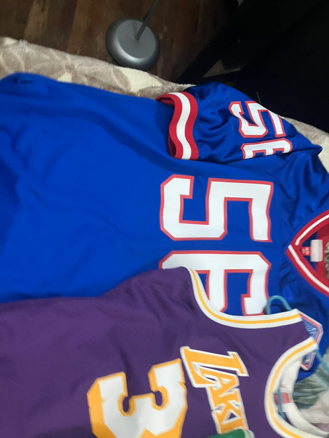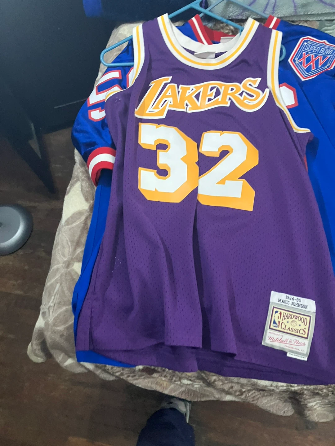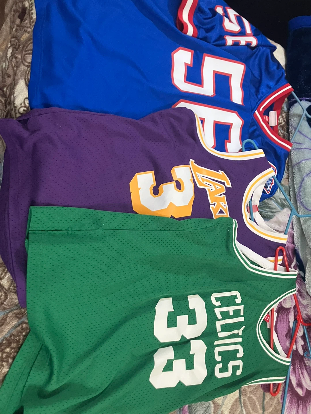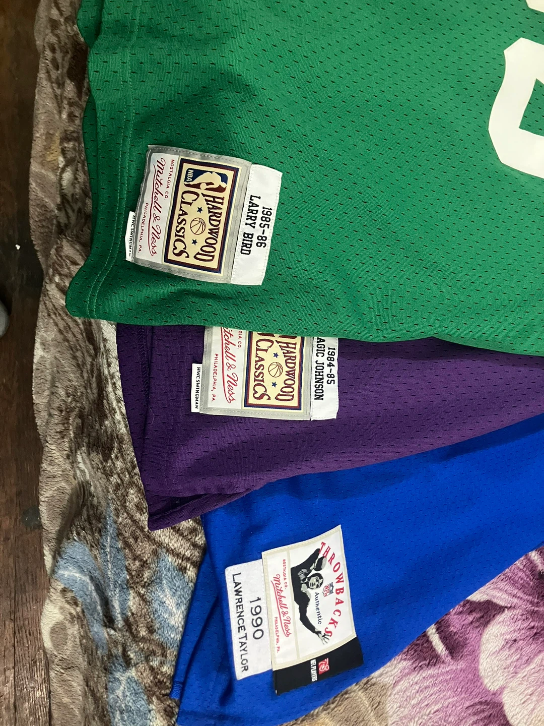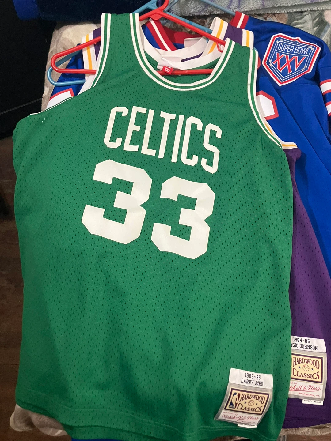 Get your hands on these classic NBA jerseys! This lot includes a purple Los Angeles Lakers #32 Magic Johnson jersey and a green Boston Celtics #33 Larry Bird jersey, both from Mitchell & Ness Hardwood Classics. Also included is a blue New York Giants #56 Lawrence Taylor Throwback jersey. Perfect for any basketball or football fan's collection!