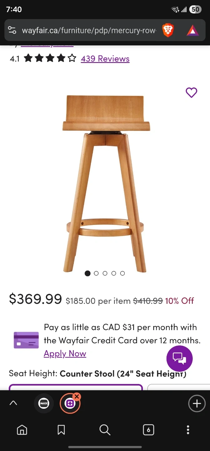 Selling a set of two counter height chairs/ Bar stools with a nature finish. They are 24 inches in height. The chairs are band new in box. Current price at wayfare 370$