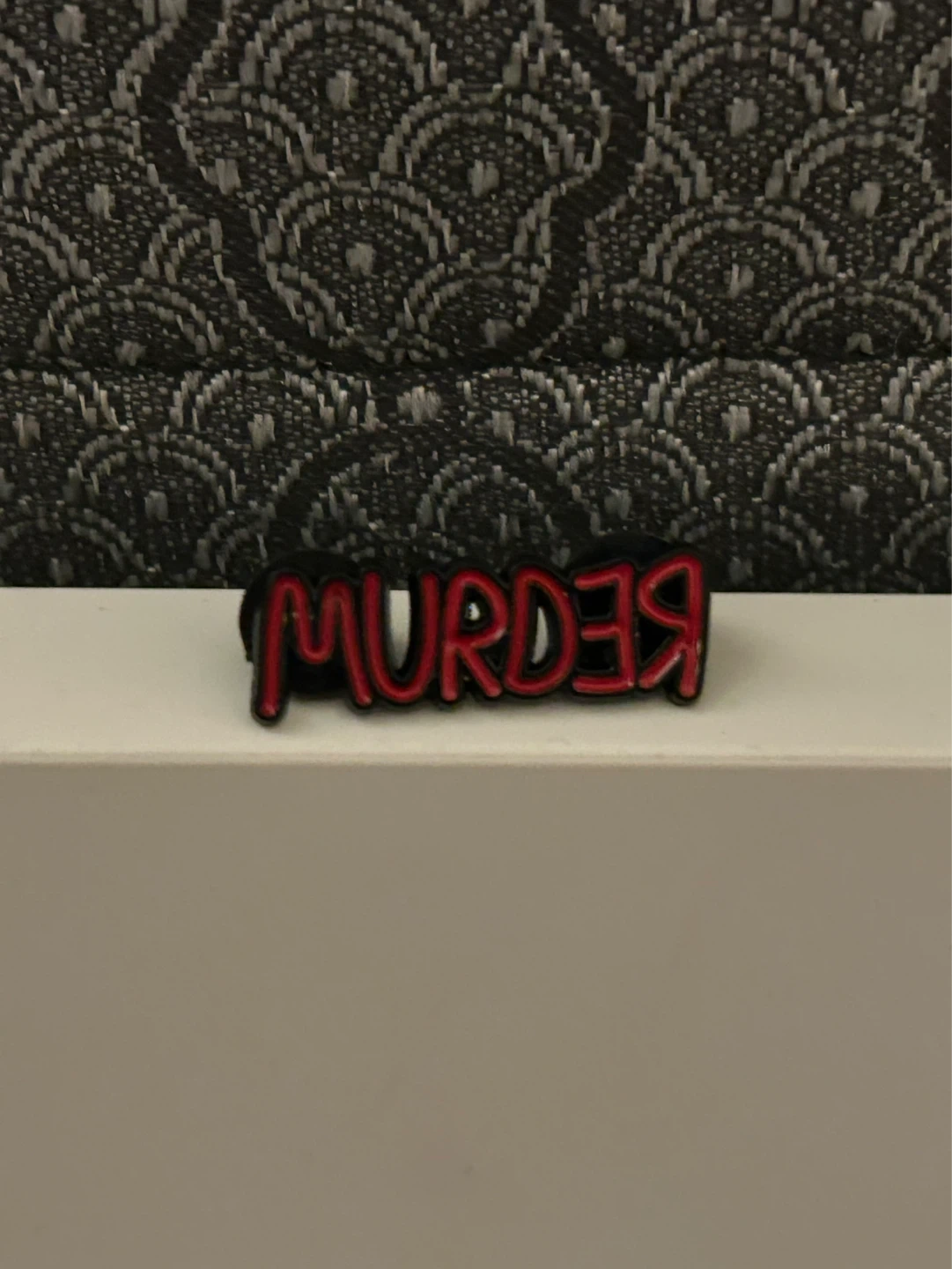 This black enamel pin features the iconic "REDRUM" and "MURDER" text from The Shining. It's a cool collectible for fans of the horror movie. The pin has a black background with red lettering.