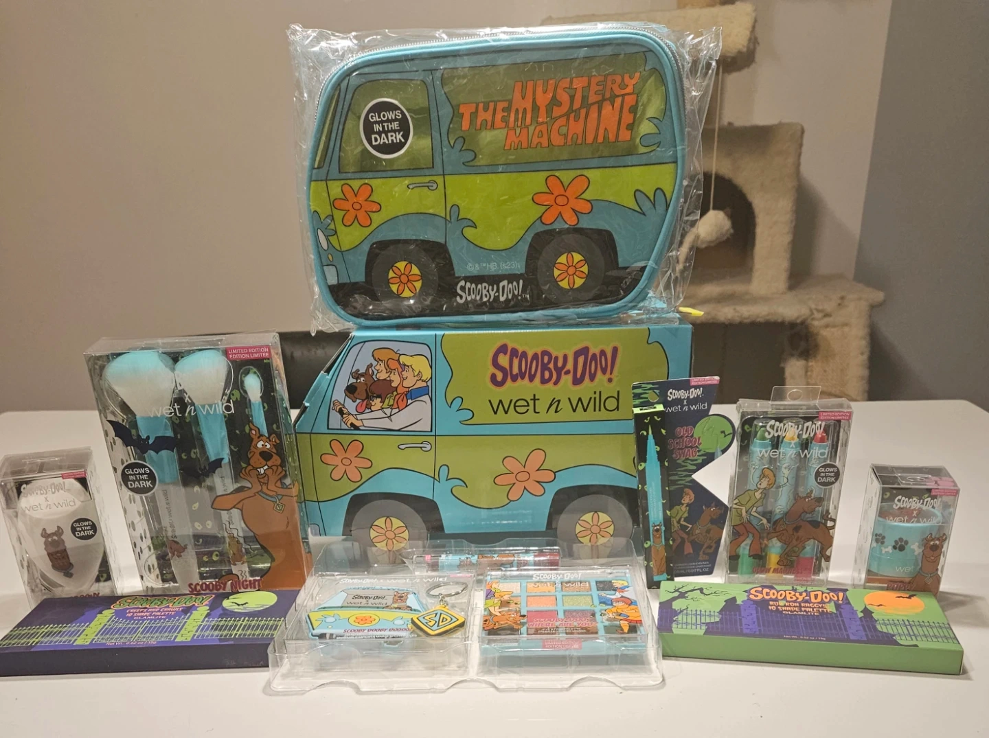 This limited edition Wet n Wild collection features Scooby-Doo themed makeup and accessories. The Mystery Machine themed makeup bag glows in the dark! It includes eyeshadow palettes, makeup brushes, and other fun items. Perfect for Scooby-Doo fans!