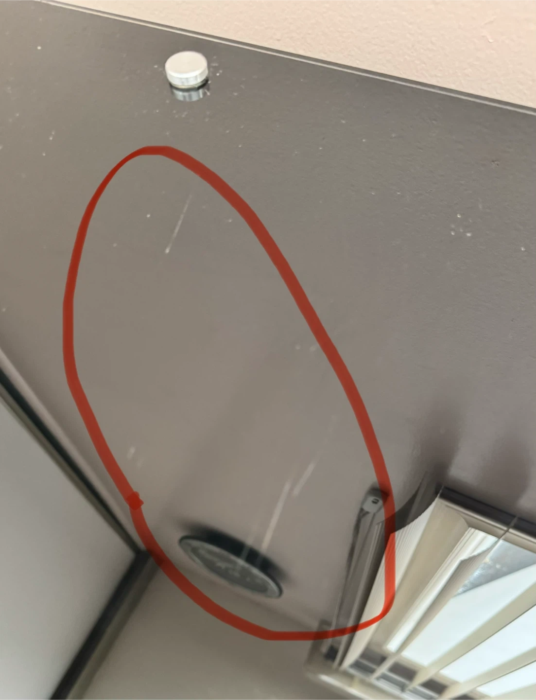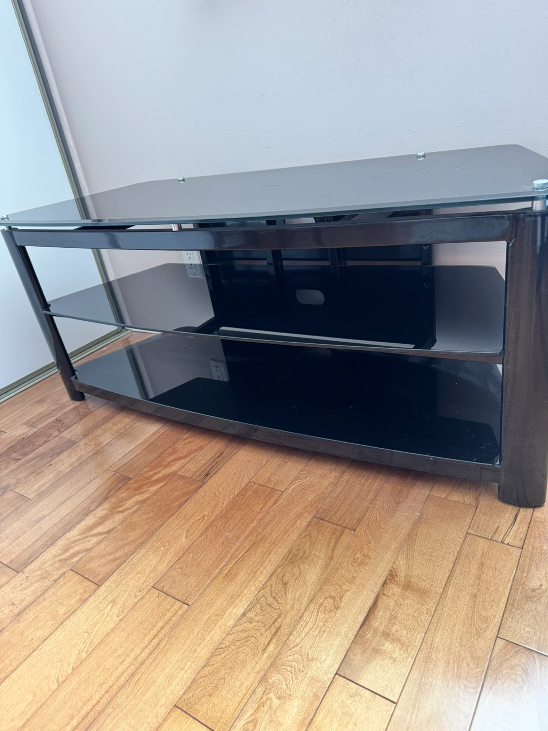 This is a sleek, black glass TV stand with three tiers. It's made of tempered glass and has a modern design. Holds most flat-screen TVs up to 50 inches. A few minor scratches as seen in last picture.