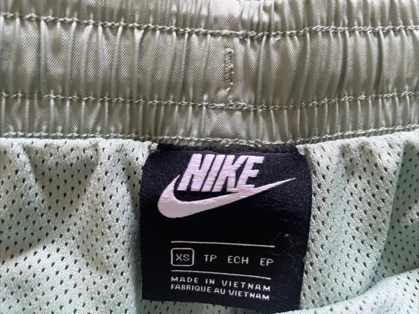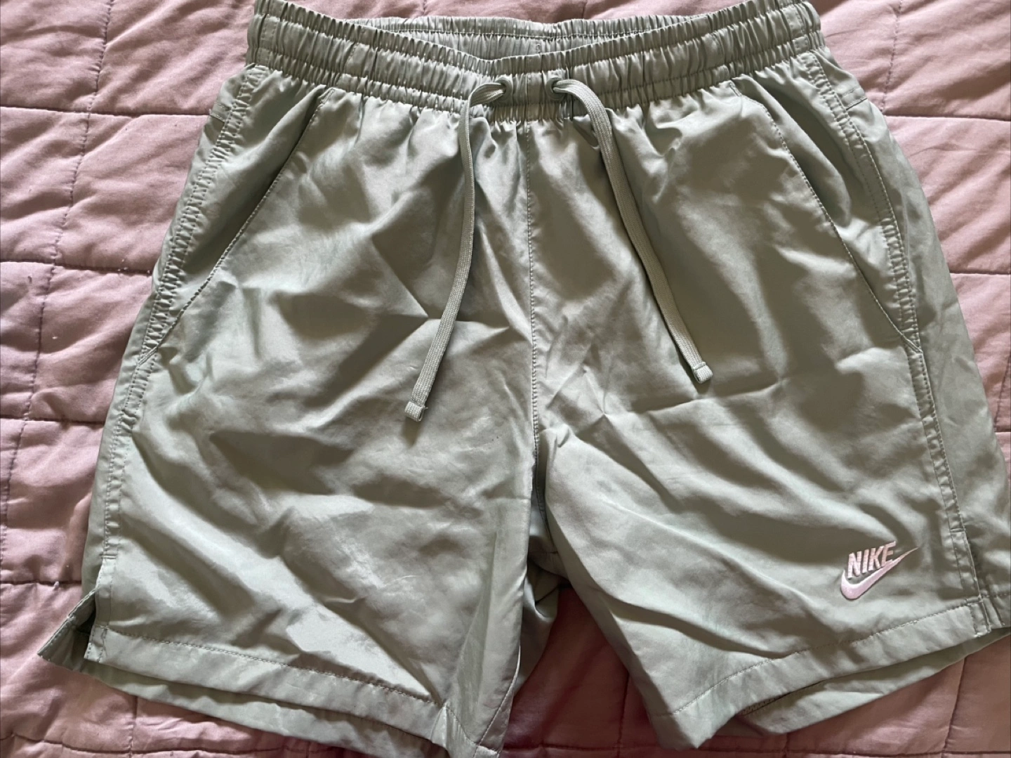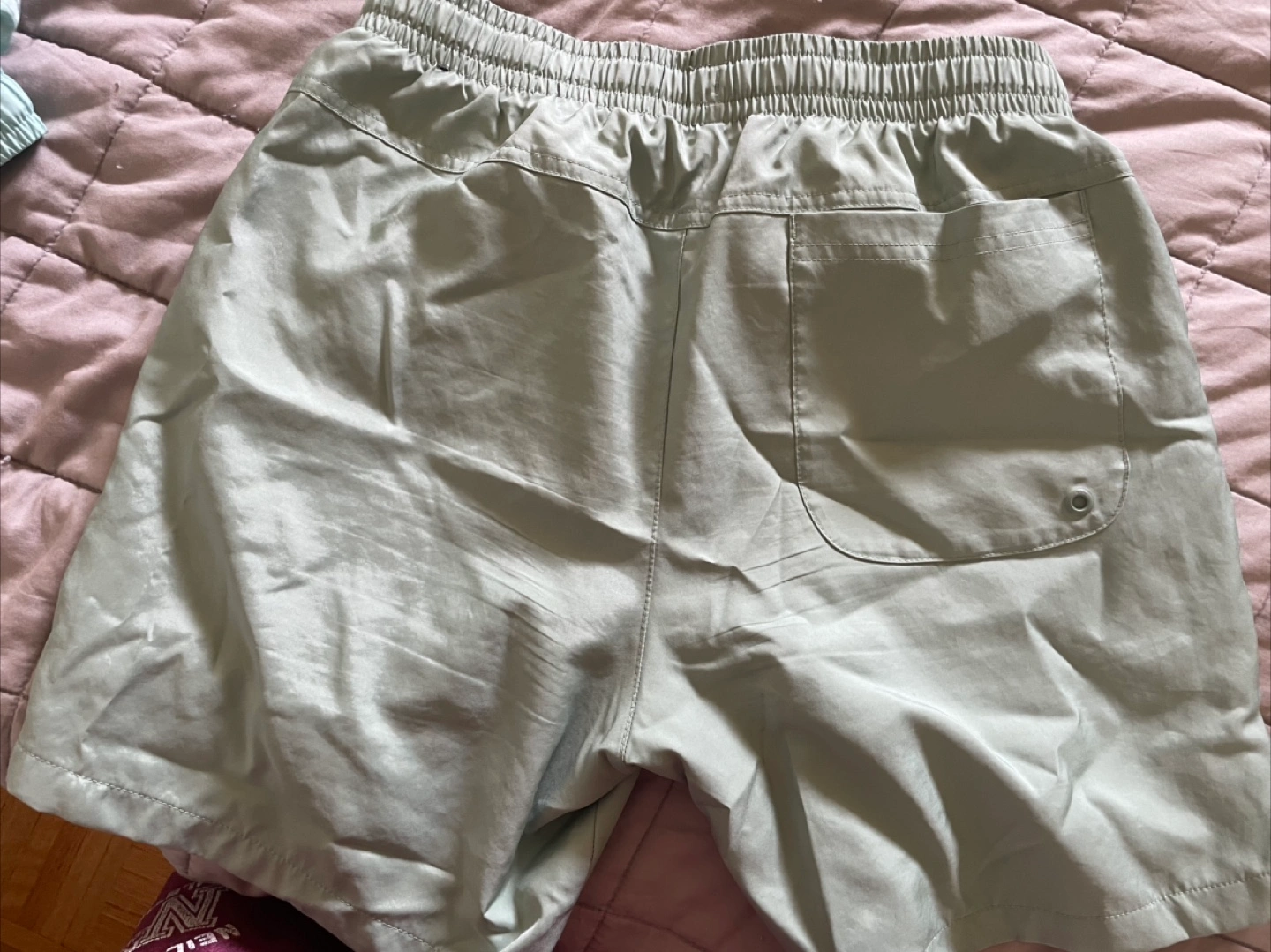 Nylon light green shorts. Elastic waistband with drawstring. Features two front pockets and a back pocket. Imagine yourself wearing these shorts while enjoying a relaxing walk on a sunny day.