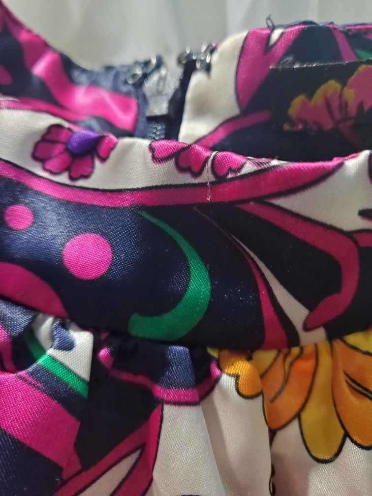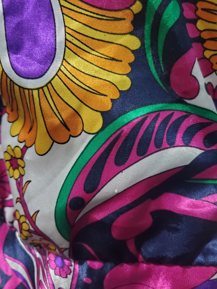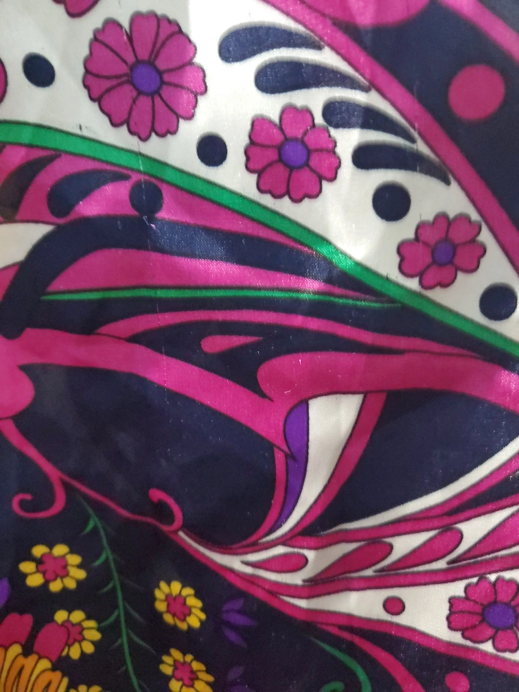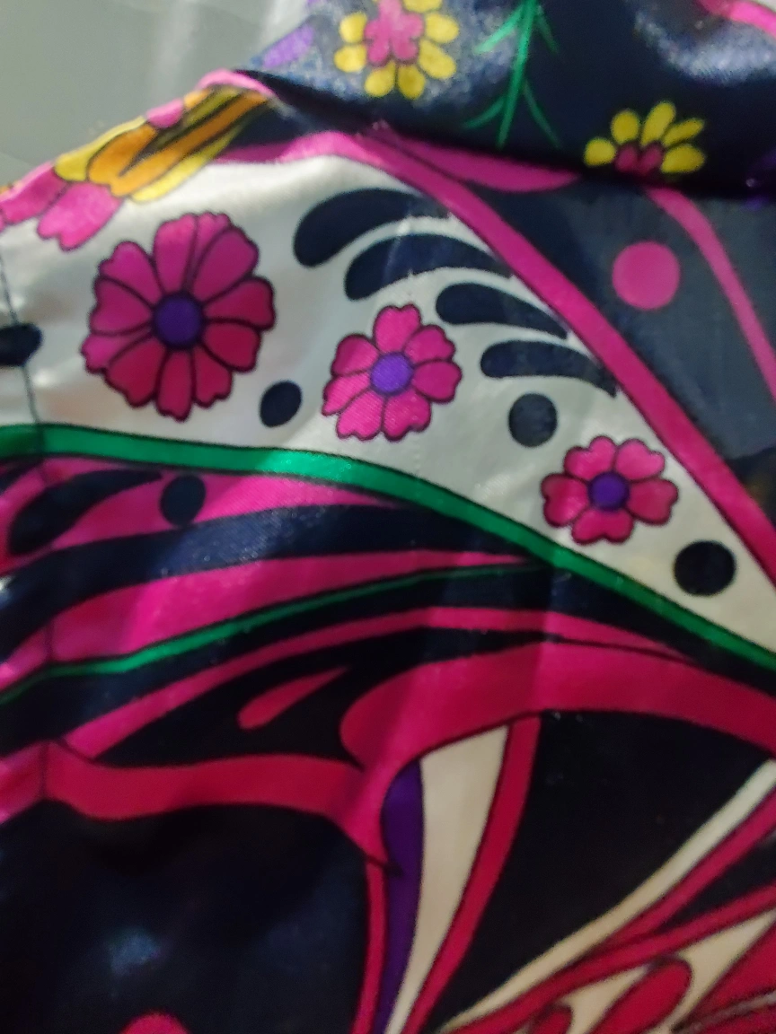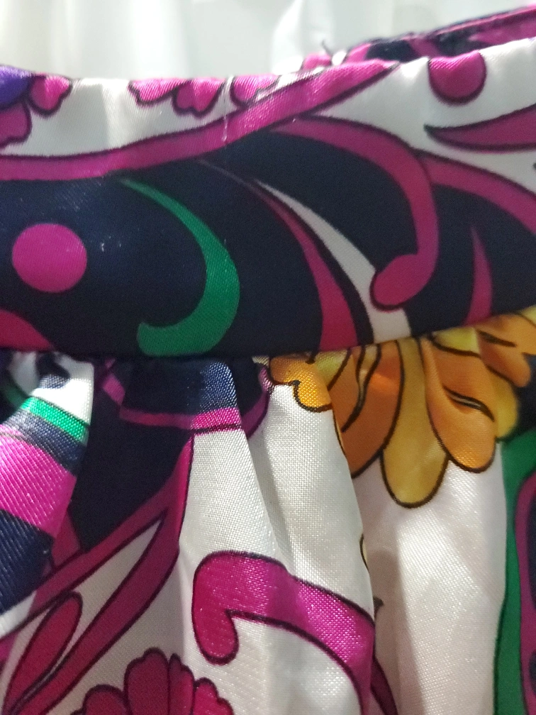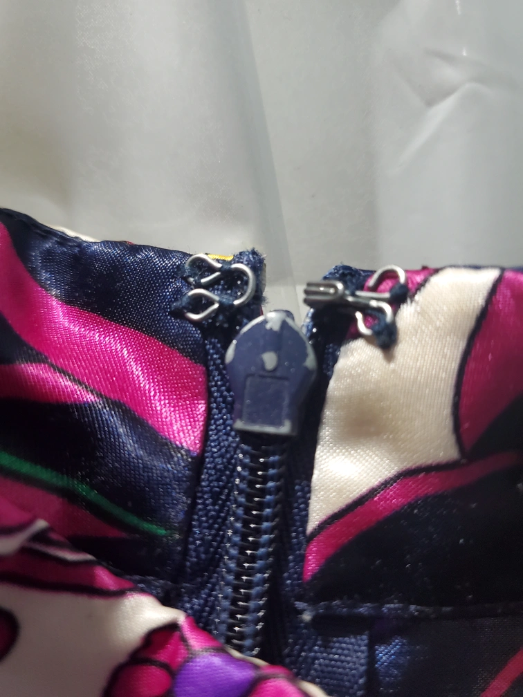 Size L. In good, preloved condition, but has a few barely noticeable snags on the fabric, as seen on the listing photos. Two near the back shoulders, one at the front collar, a few at the front body and one at the bottom trim om the frontsize. They are hard to notice. backside of zipper has slight wear. Overall condition is good. Very light feeling, perfect for summer. Despite material labelled as polyester, it feels light and satiny. Has a zipper at the back.