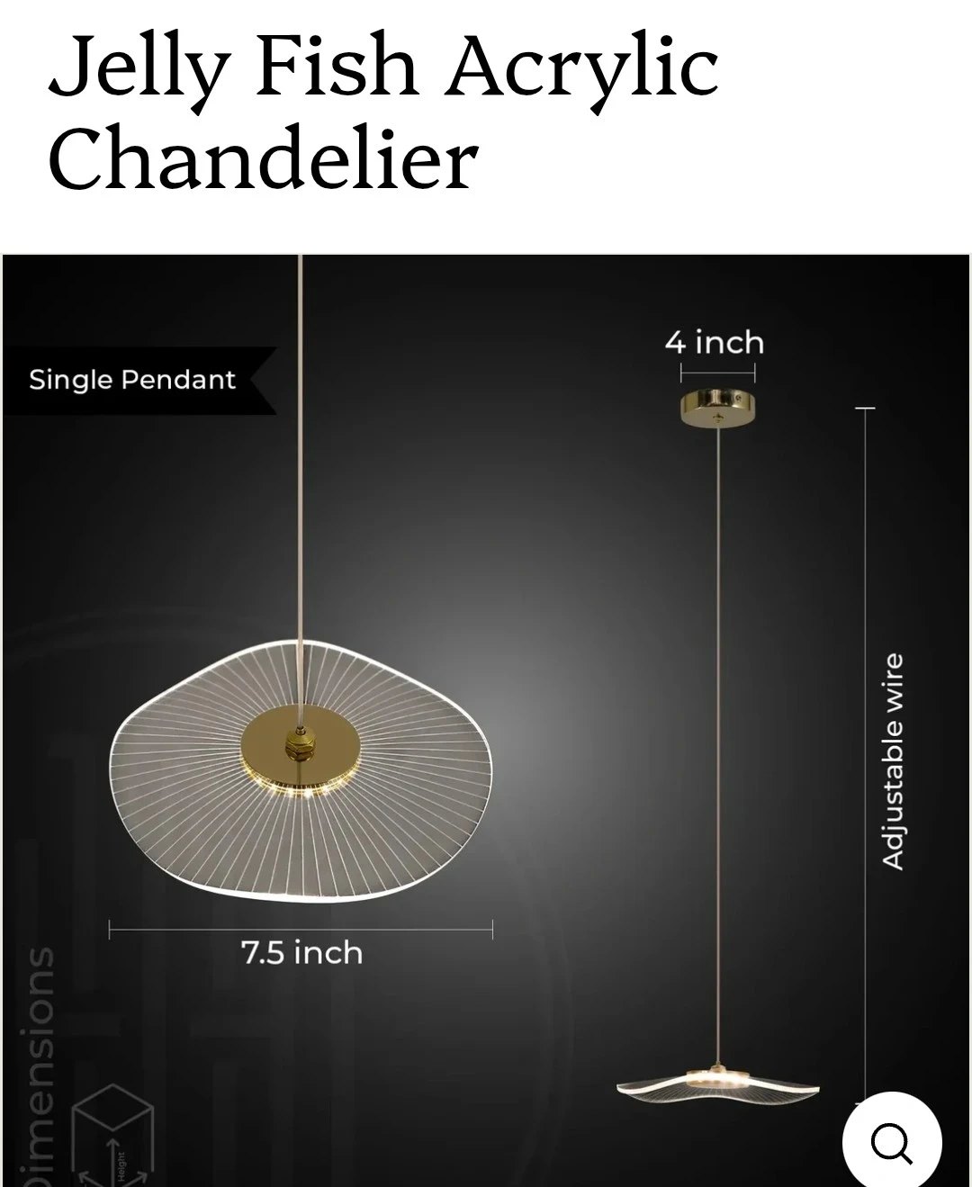 This unique pendant light features a clear acrylic shade with a modern, artistic design. It has a 7.5 inch diameter and an adjustable wire for height customization. The gold-toned canopy is 4 inches.