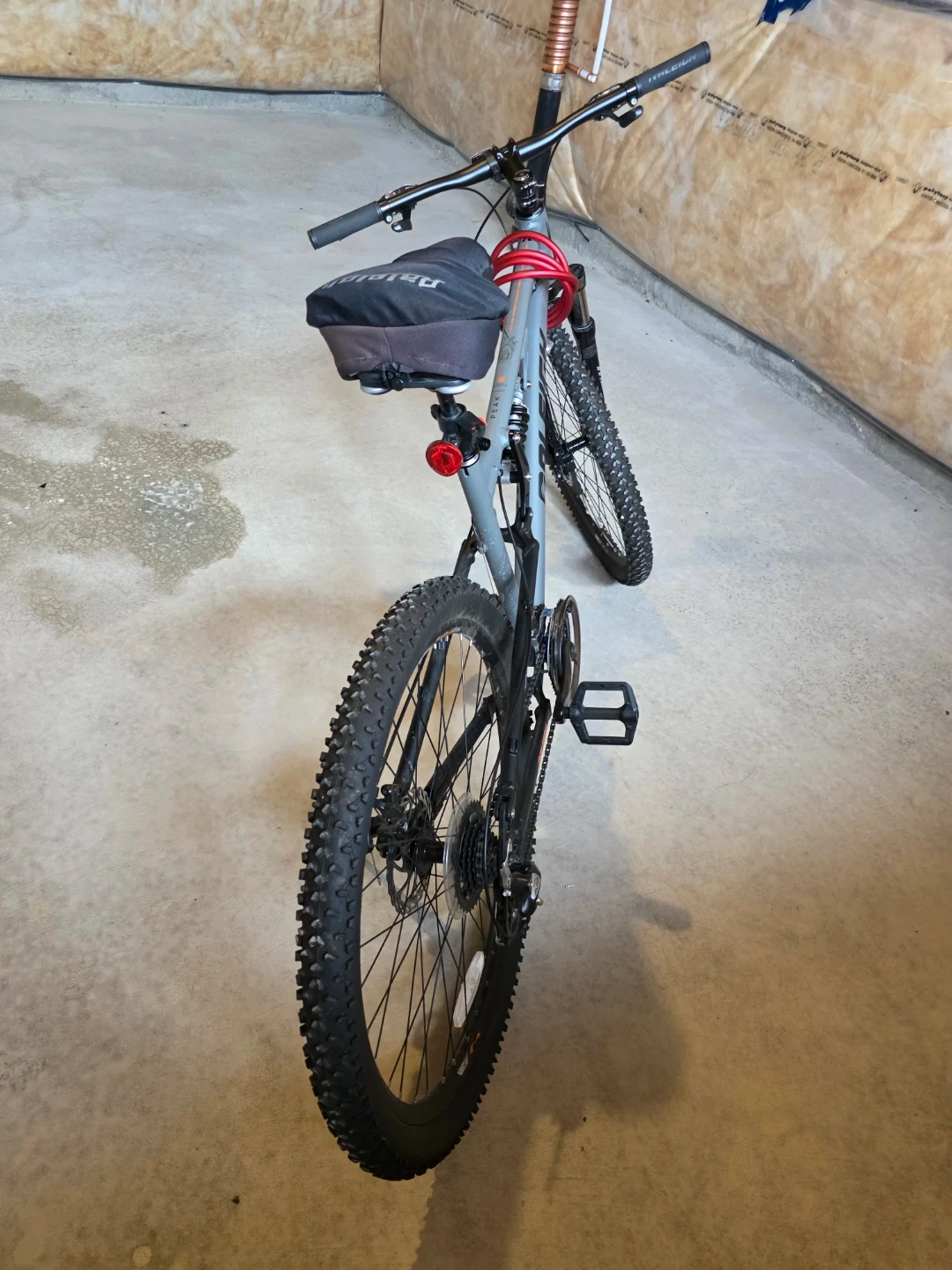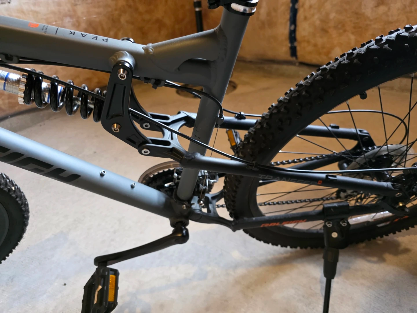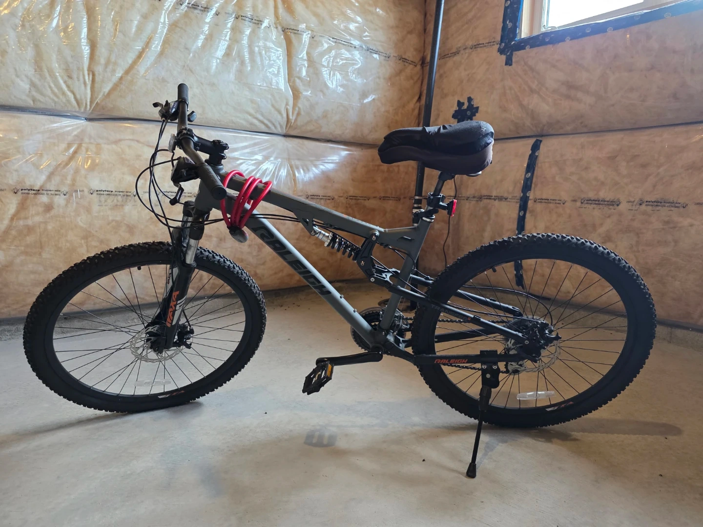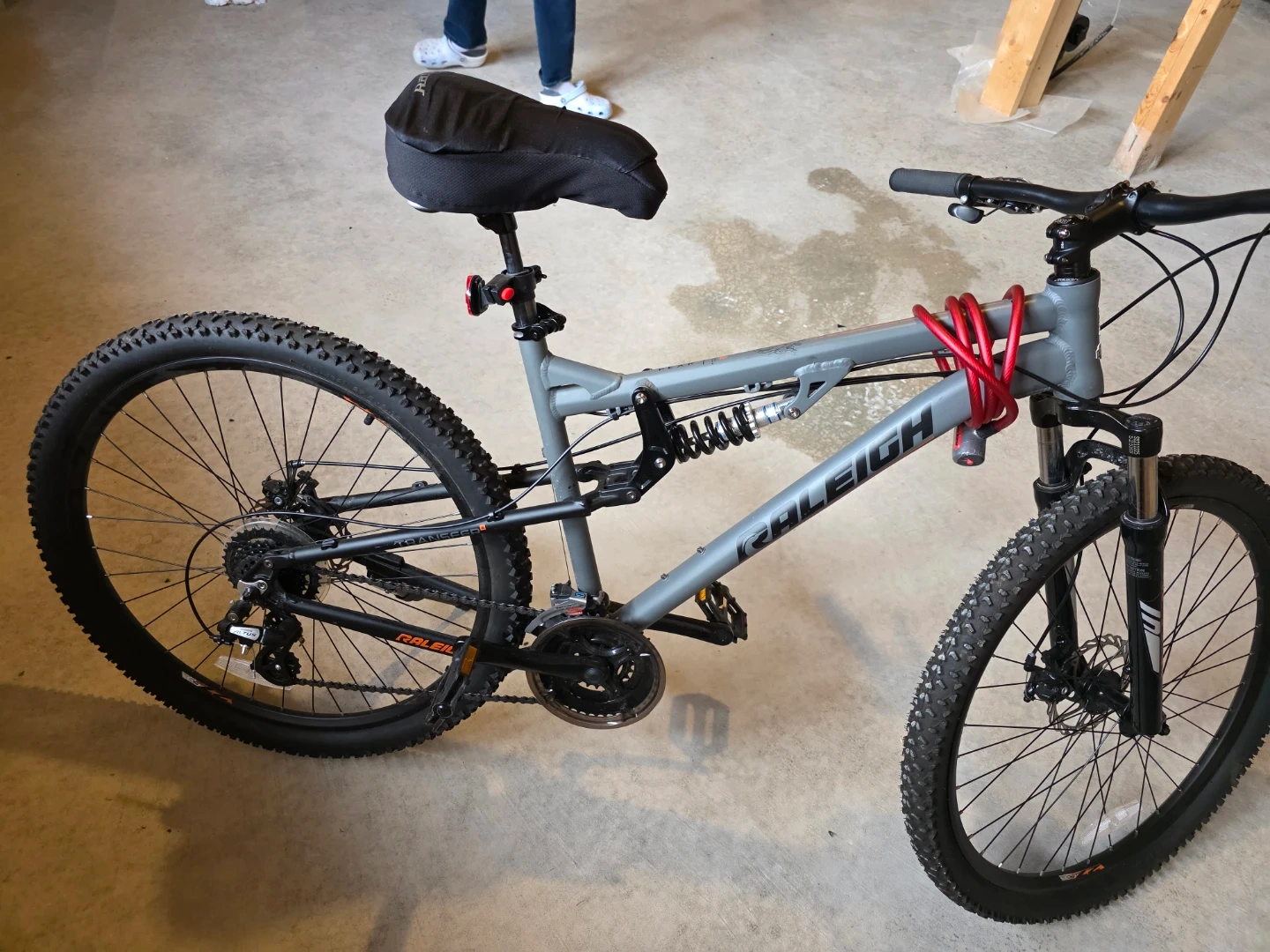 This is a grey Raleigh full-suspension mountain bike. It has front and rear disc brakes and knobby tires for off-road use. A lock is included.