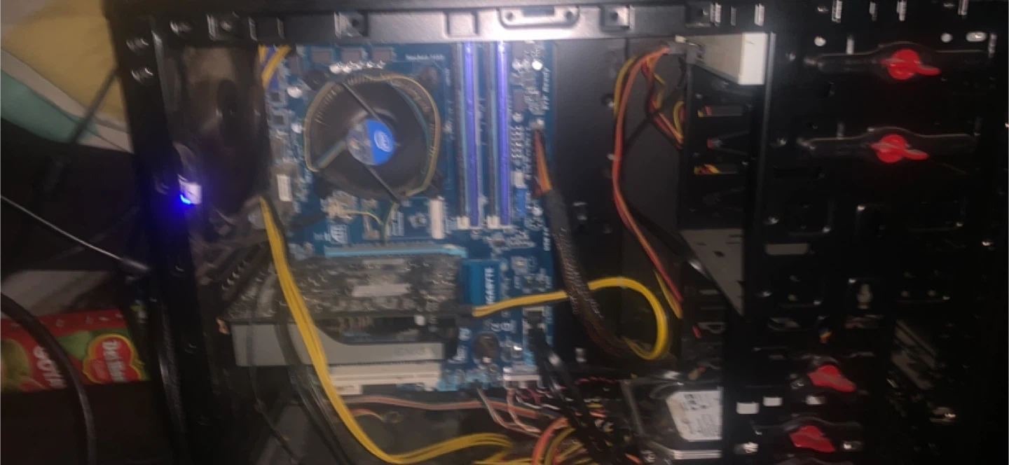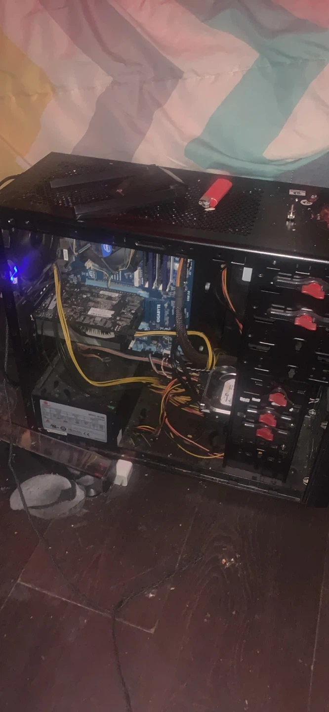 This is a black tower computer case. It's ready for your components. Inside, you'll find a motherboard and power supply already installed. This case offers plenty of space for expansion.