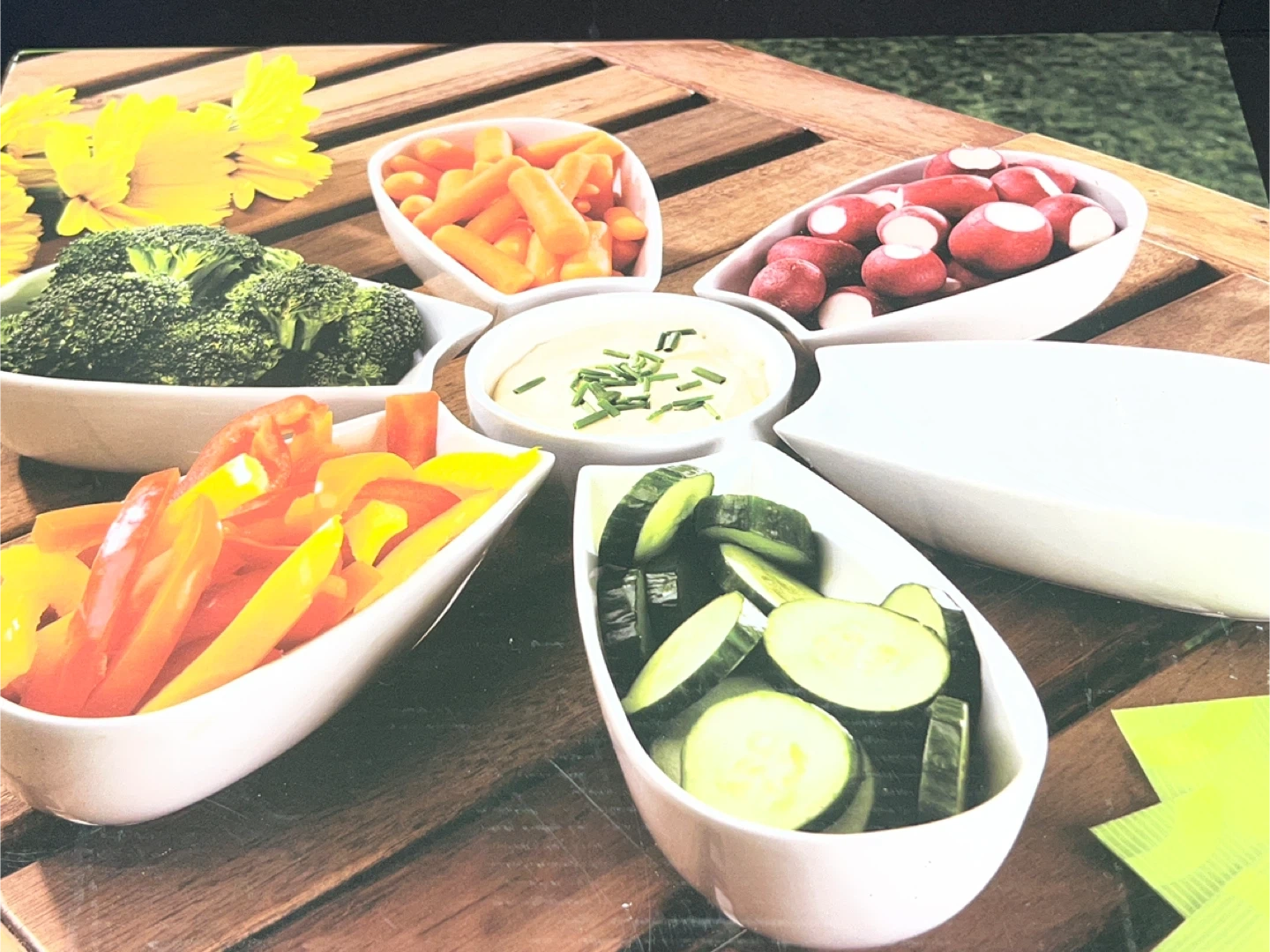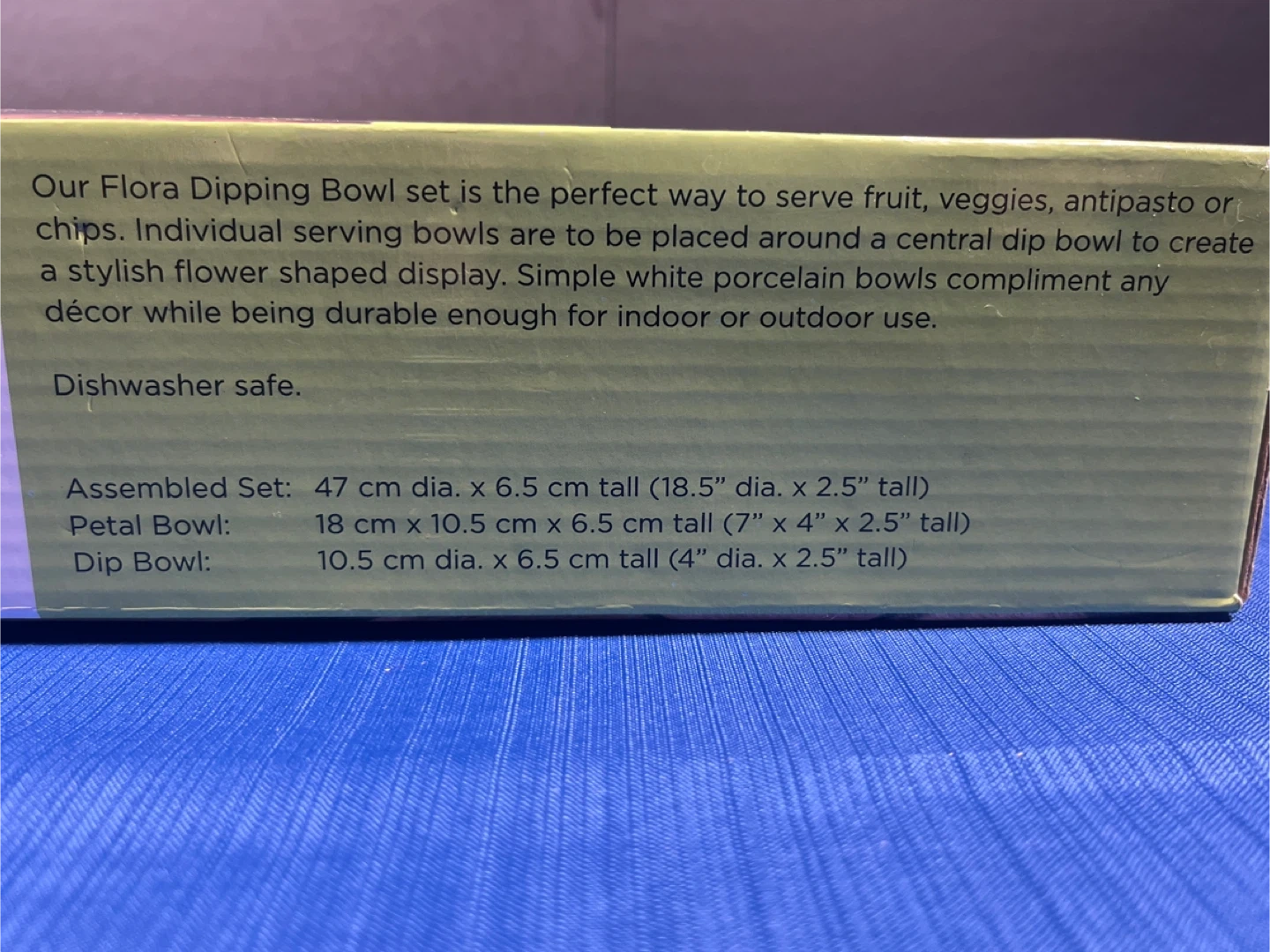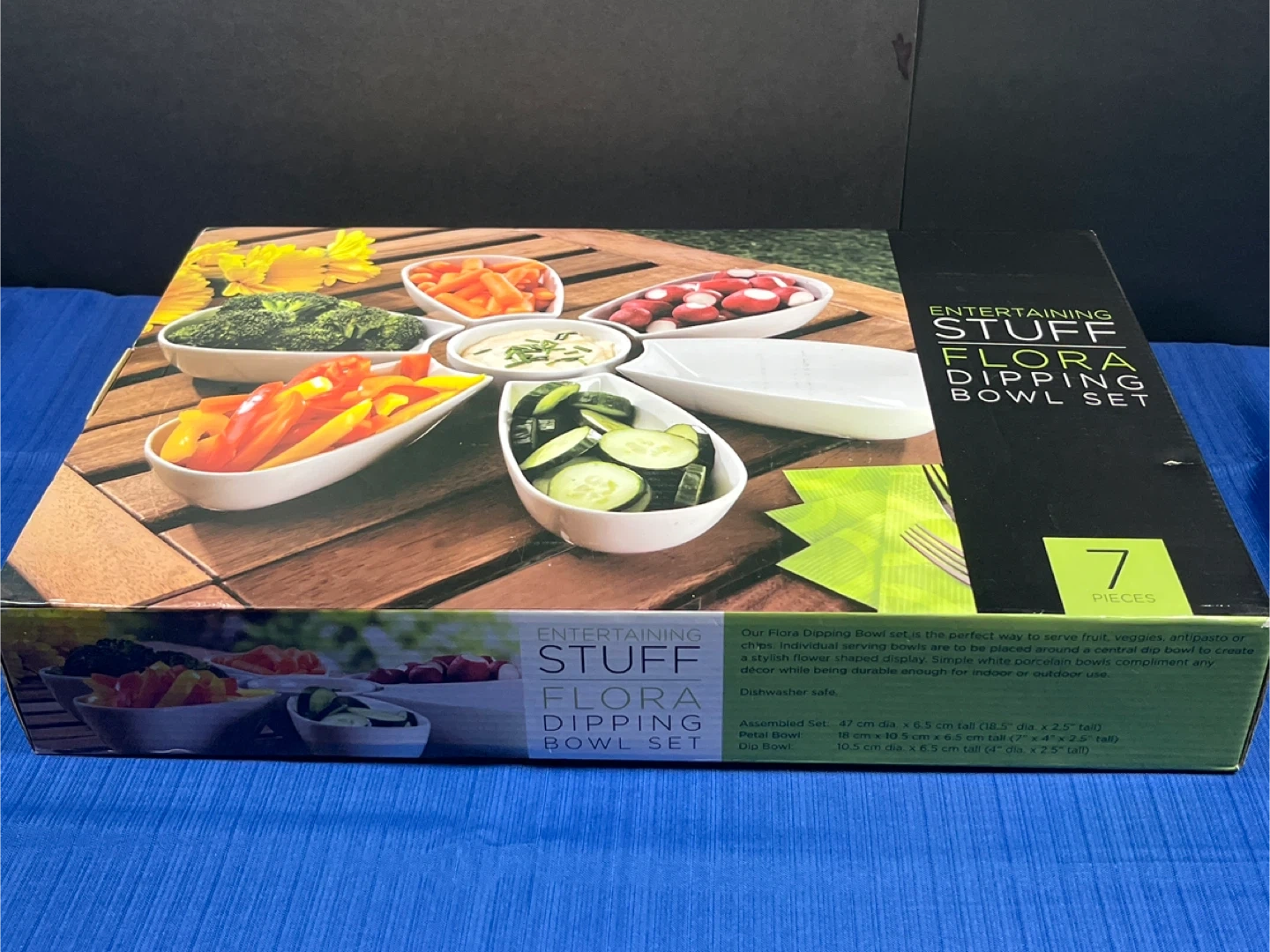 This is a new Flora Dipping Bowl Set, perfect for serving fruit, veggies, or chips in style. The set includes individual serving bowls that can be arranged around a central dip bowl to create a flower-shaped display. These porcelain bowls are durable for both indoor and outdoor use. Dishwasher safe.