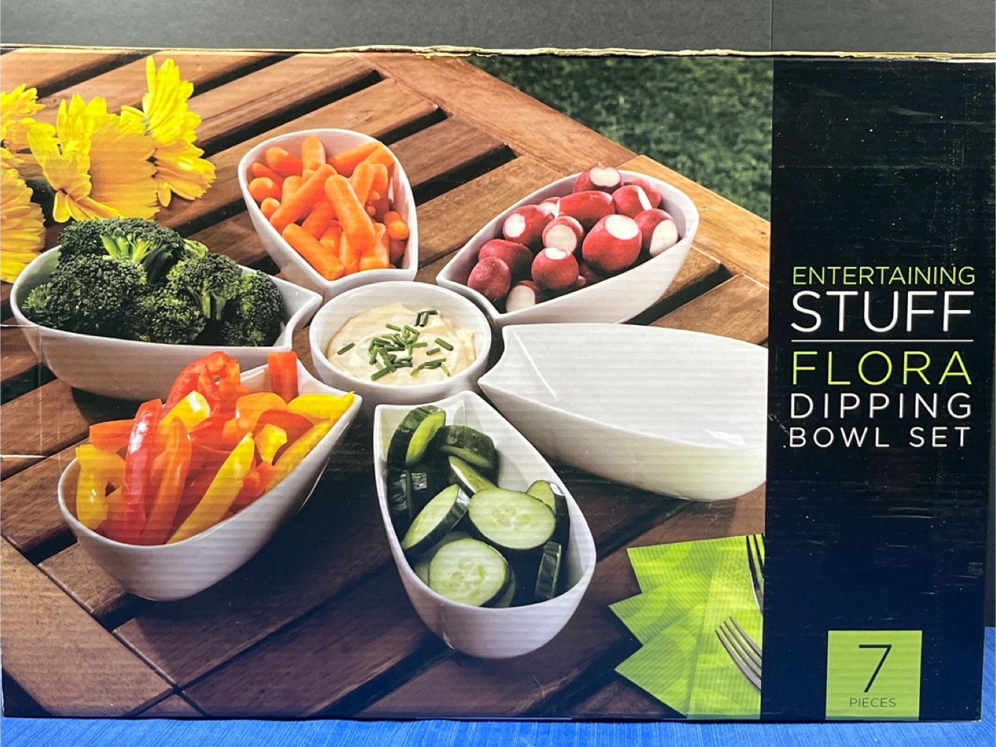 This is a new Flora Dipping Bowl Set, perfect for serving fruit, veggies, or chips in style. The set includes individual serving bowls that can be arranged around a central dip bowl to create a flower-shaped display. These porcelain bowls are durable for both indoor and outdoor use. Dishwasher safe.