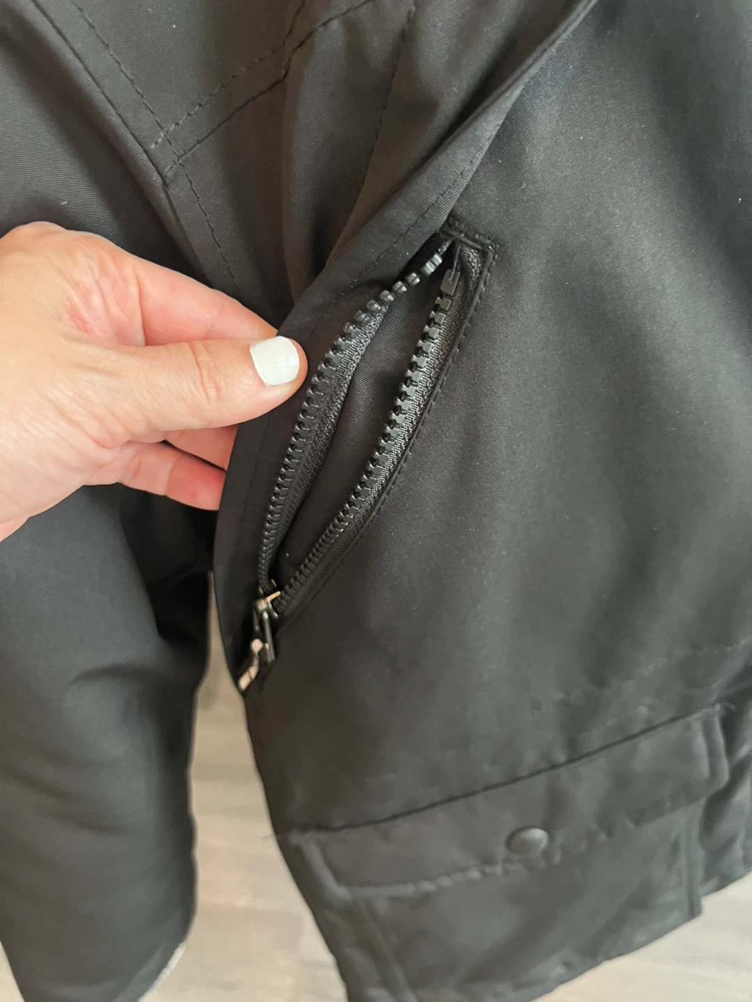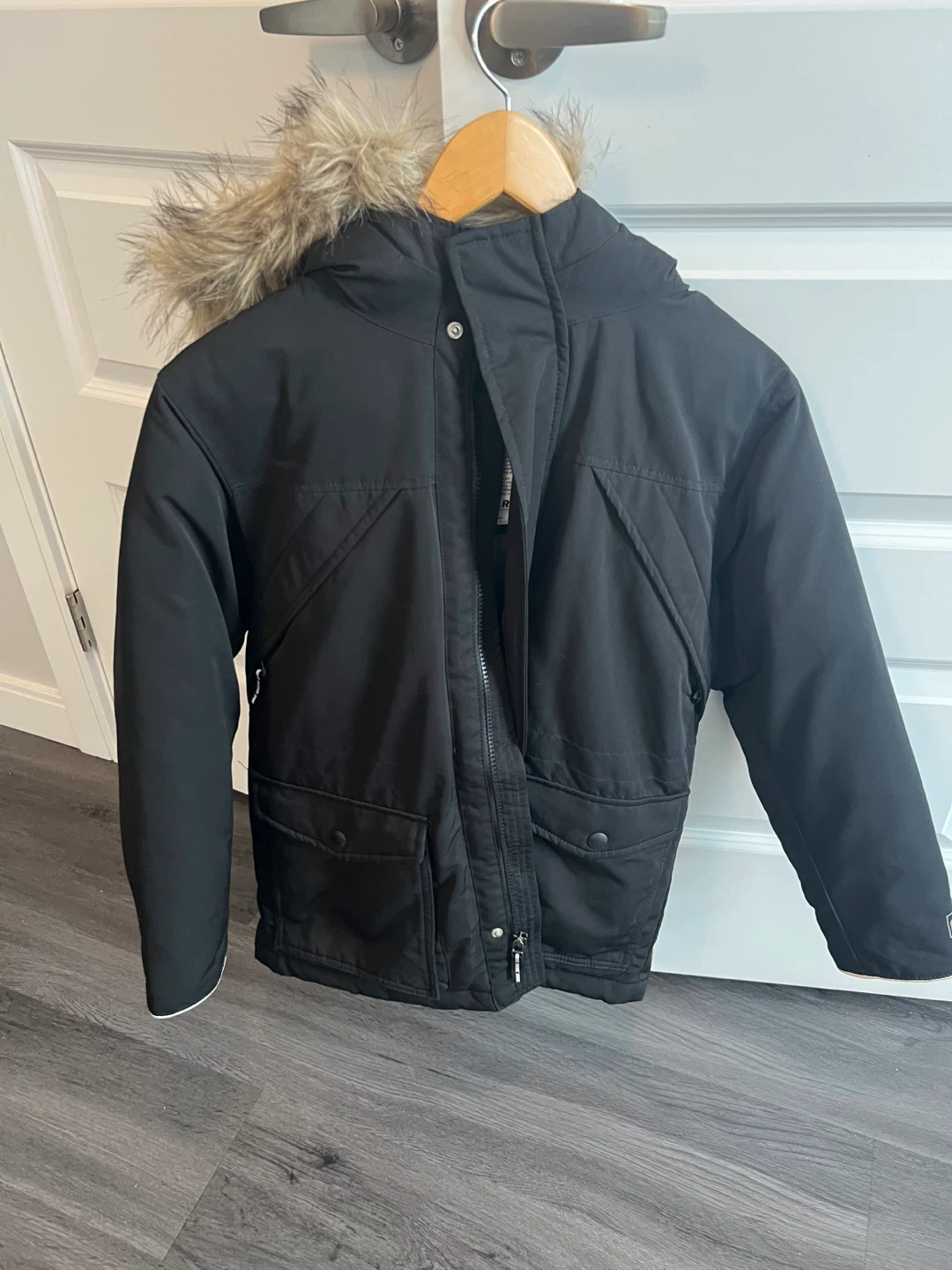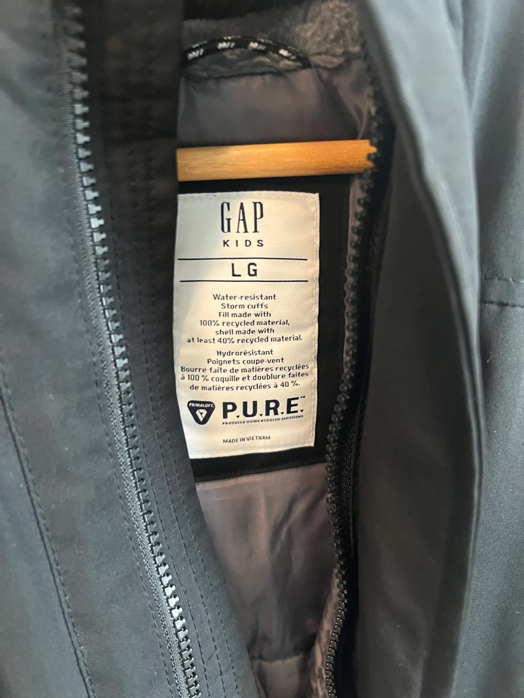 Keep your little one warm with this GAP Kids winter jacket! It's a size large and comes in classic black. The jacket is filled with 100% recycled material and the shell is made with at least 40% recycled material. It's also water-resistant, perfect for those snowy days