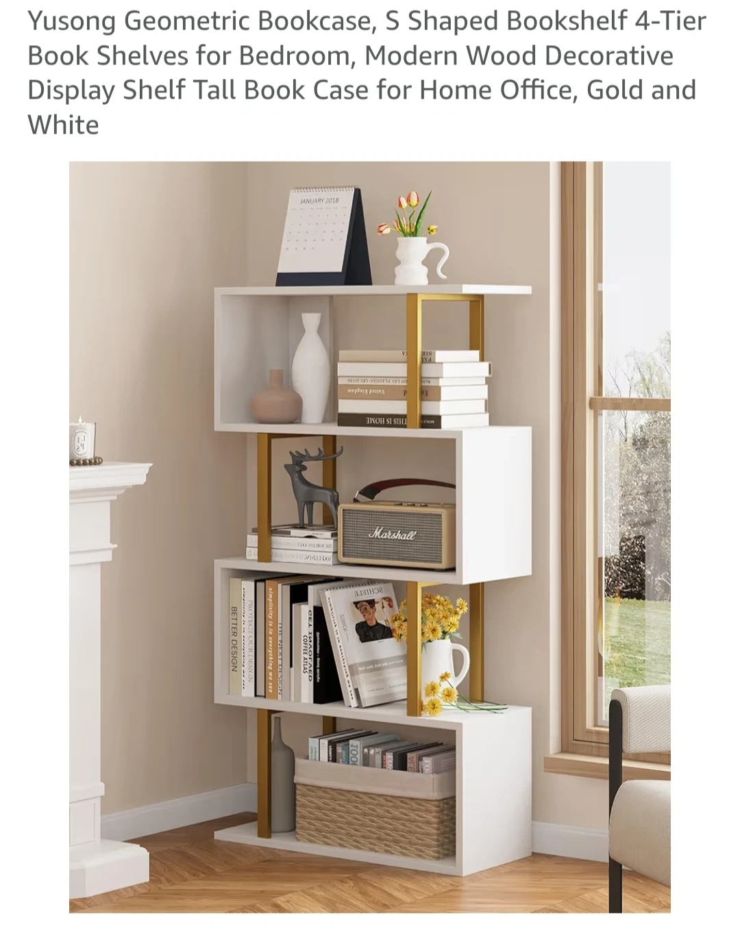 Selling a Yusong geometric bookcase in excellent condition! It features a modern S-shaped design with 4 tiers, perfect for a bedroom, home office, or living room. The bookshelf is white with gold accents.