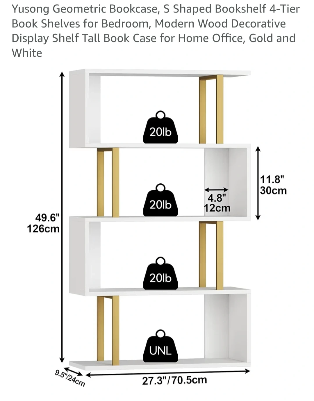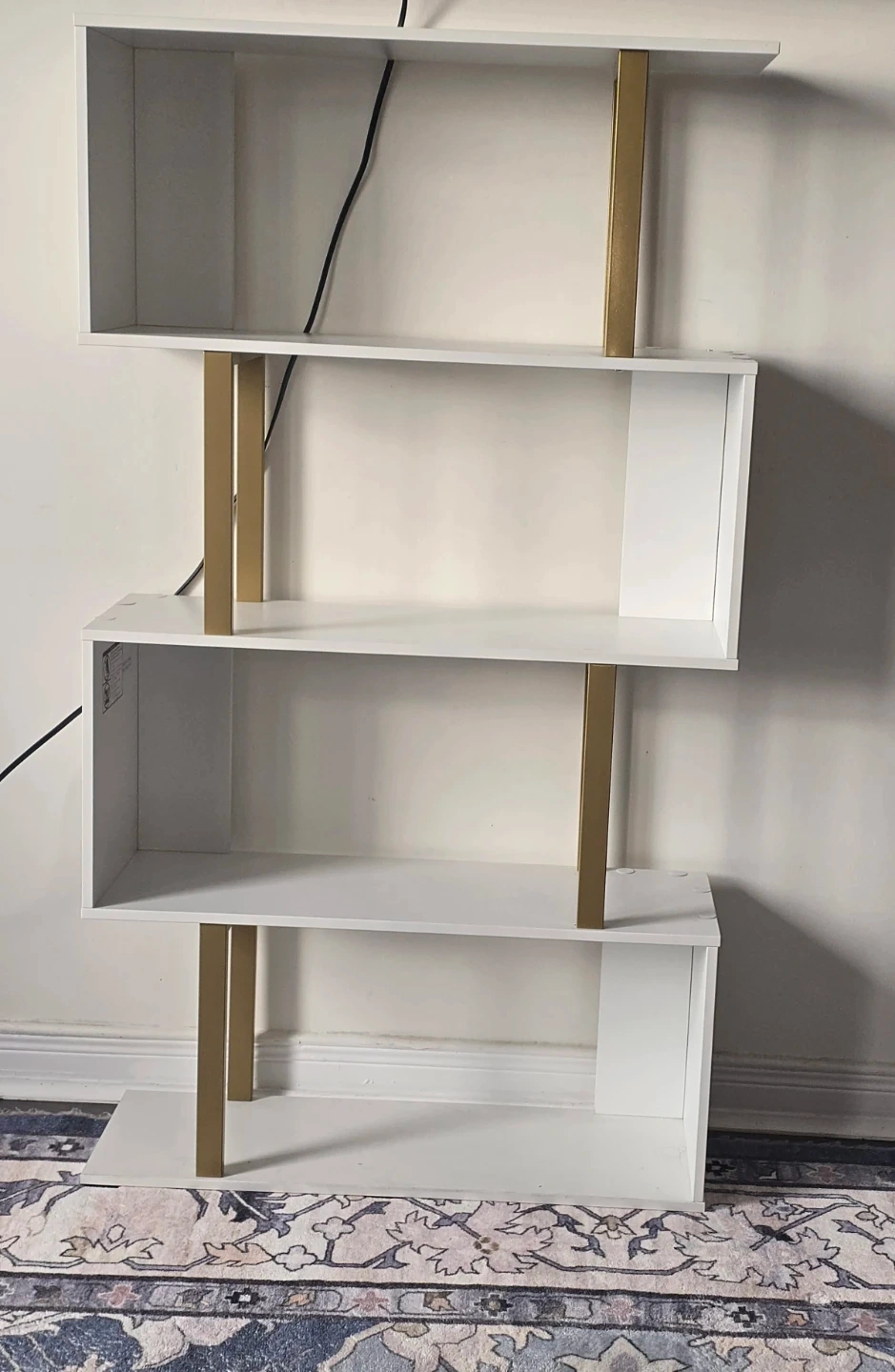 Selling a Yusong geometric bookcase in excellent condition! It features a modern S-shaped design with 4 tiers, perfect for a bedroom, home office, or living room. The bookshelf is white with gold accents.
