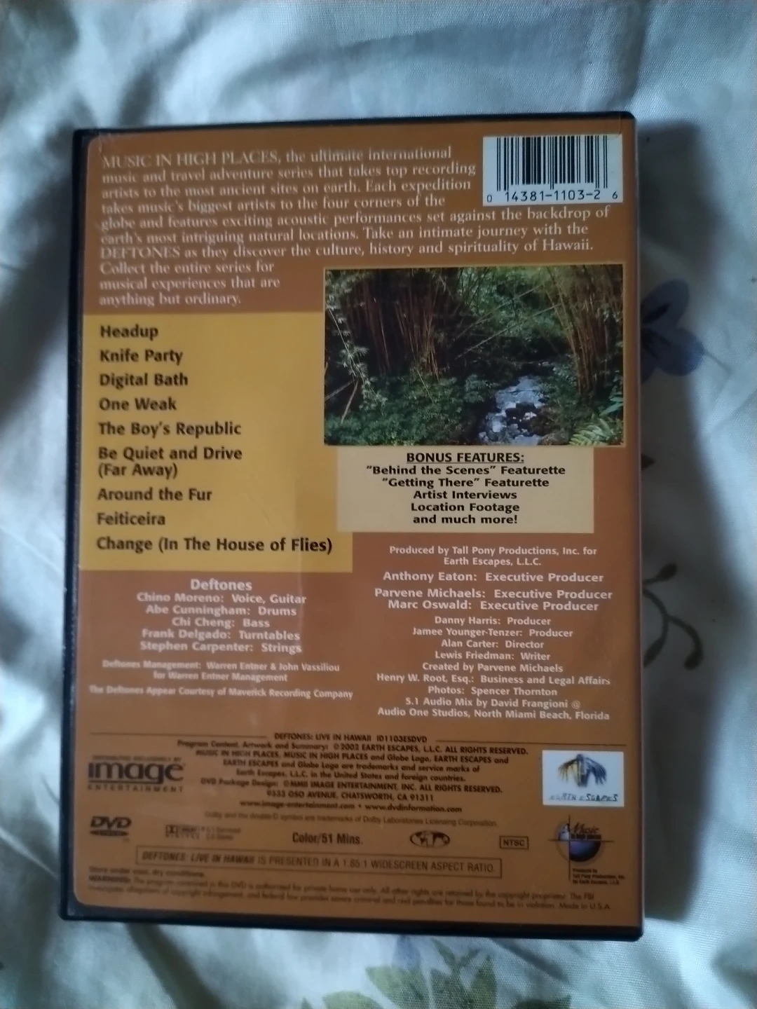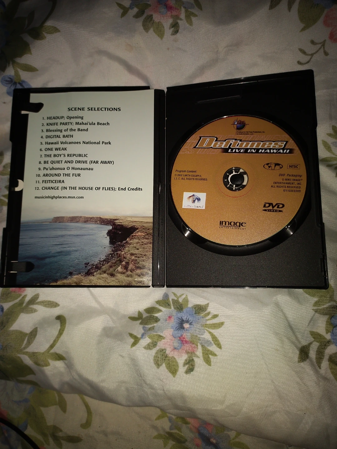 Selling a Deftones Live in Hawaii DVD. It runs for 61 minutes and is presented in 1.85:1 widescreen aspect ratio. The DVD includes bonus features such as "Behind the Scenes" featurette, "Getting to Know Deftones" Featurette, Artist Interviews, Location Footage, and much more!