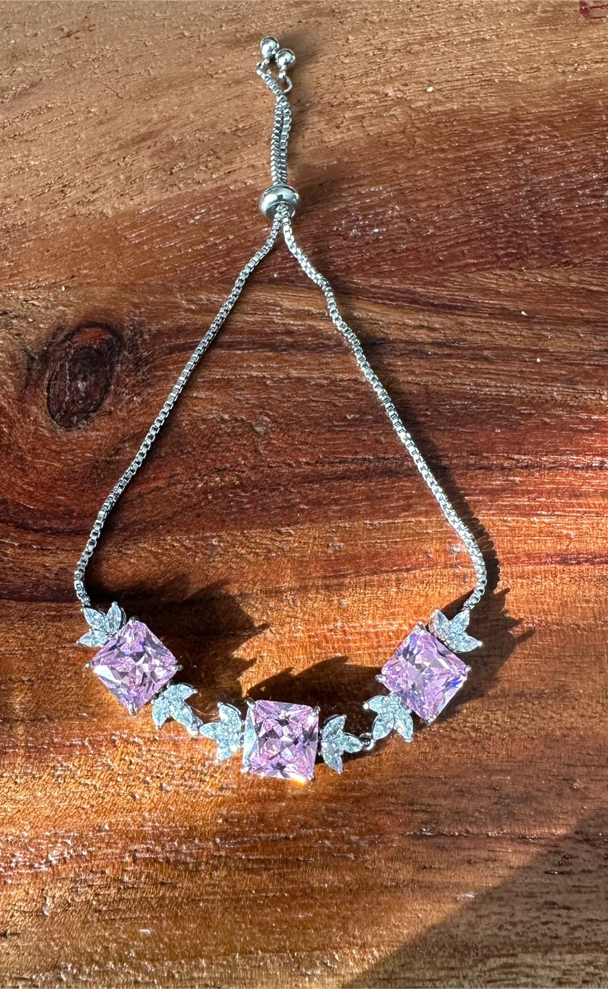 A sparkly silver adjustable bracelet featuring three square-cut pink gems, accented with smaller clear stones. It's crafted with a delicate box chain and a sliding bead closure for a custom fit. This piece would add a touch of colour to any outfit!