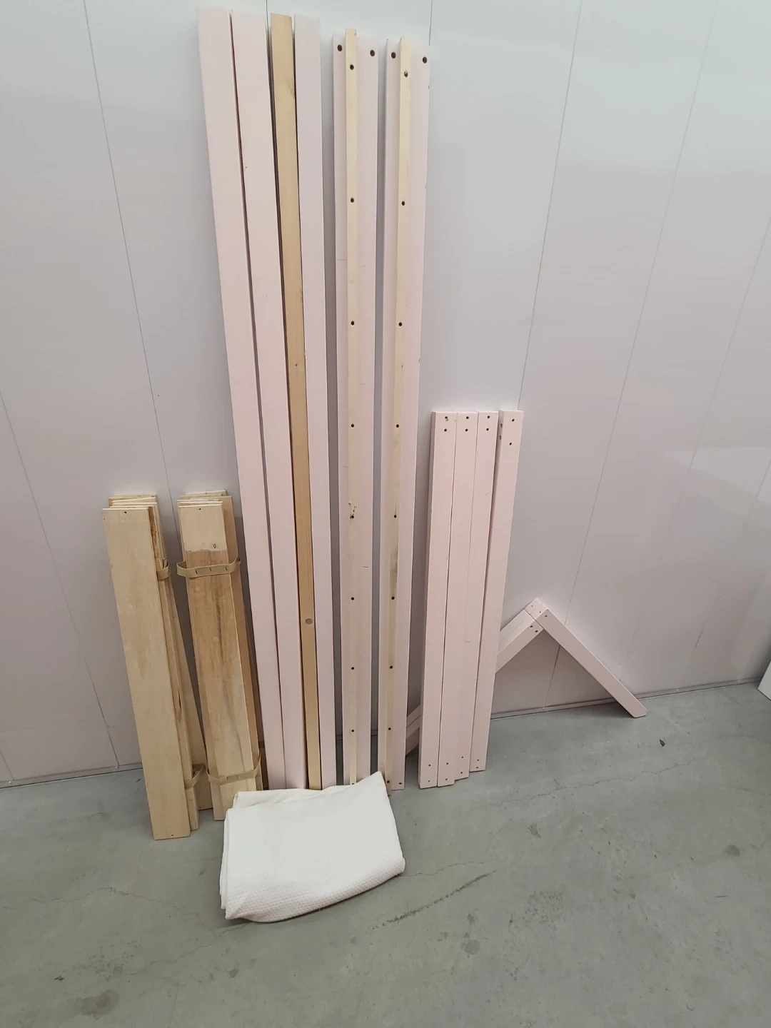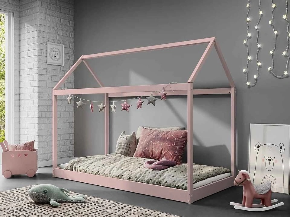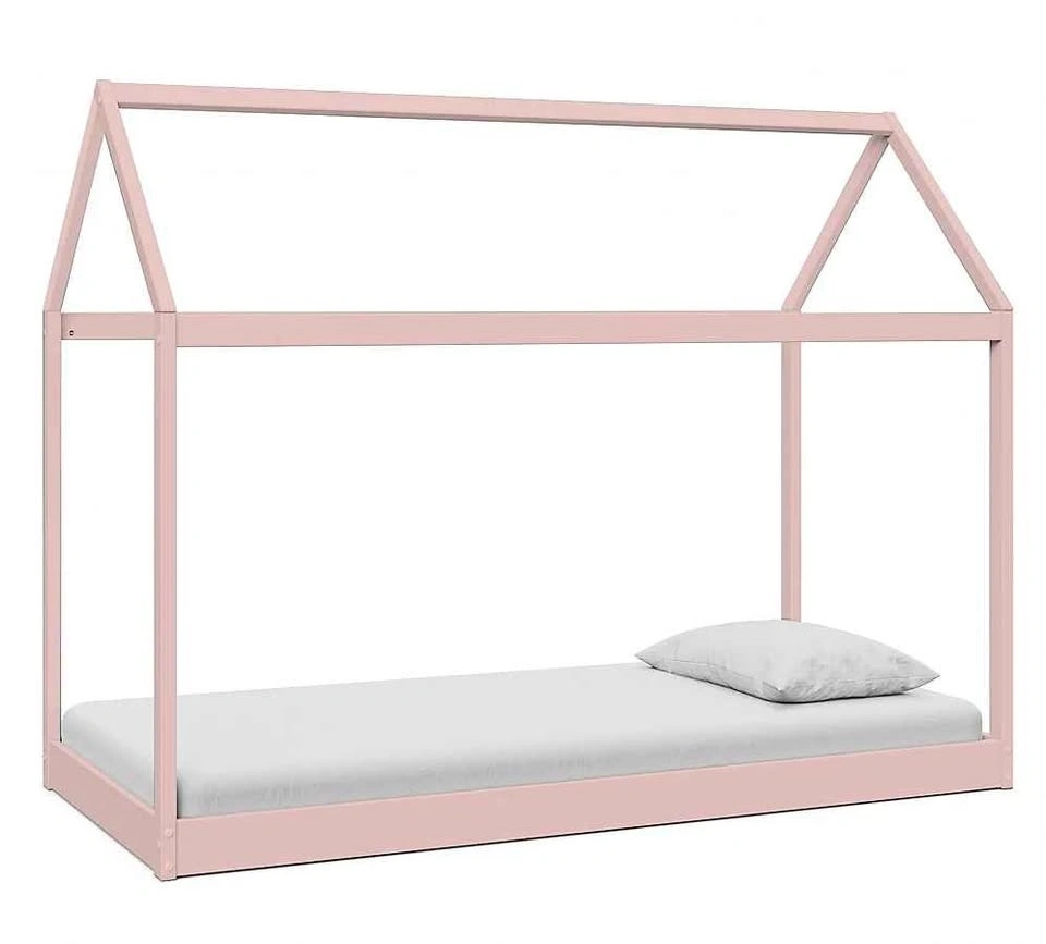 Low profile Twin size bedframe in a cute house shape, light pink color.