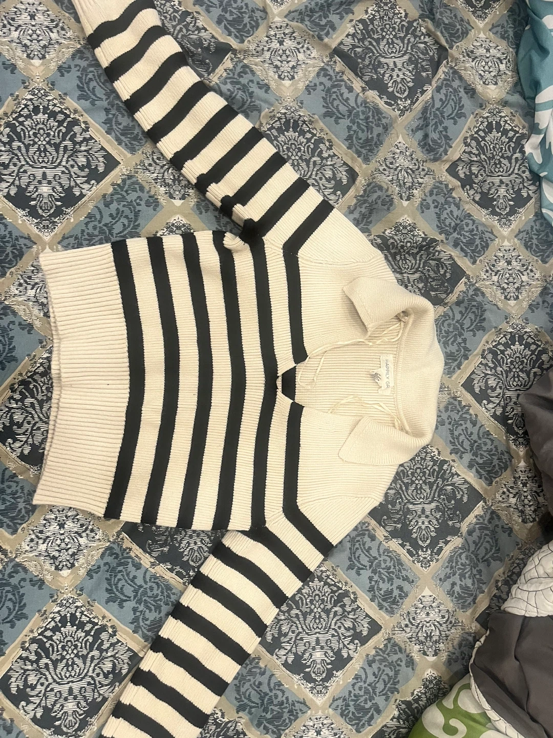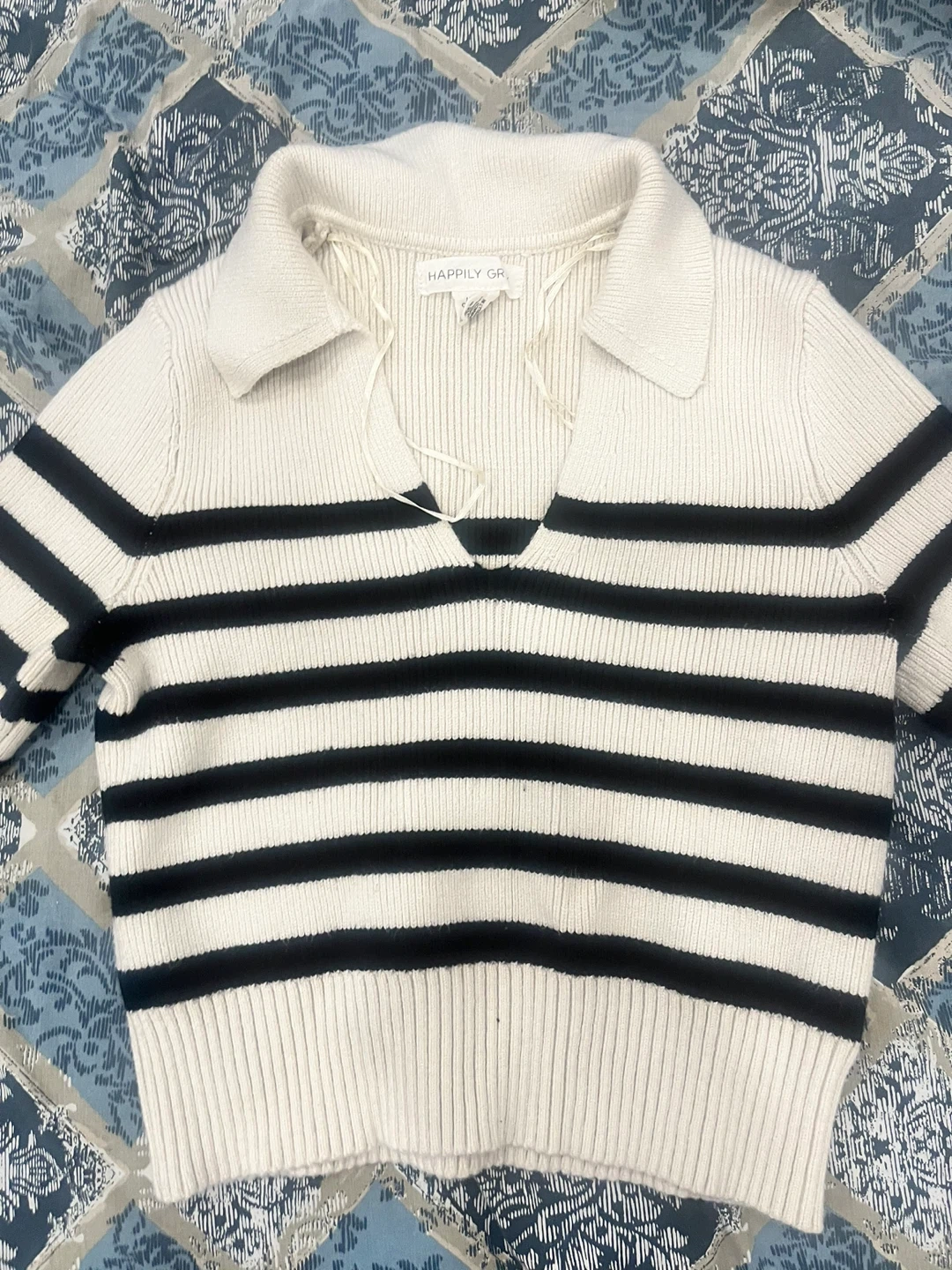 This is a ribbed knit sweater with a collared neckline and a deep V-cut. It features a classic black and white stripe pattern. Ribbed cuffs and hem complete the look.