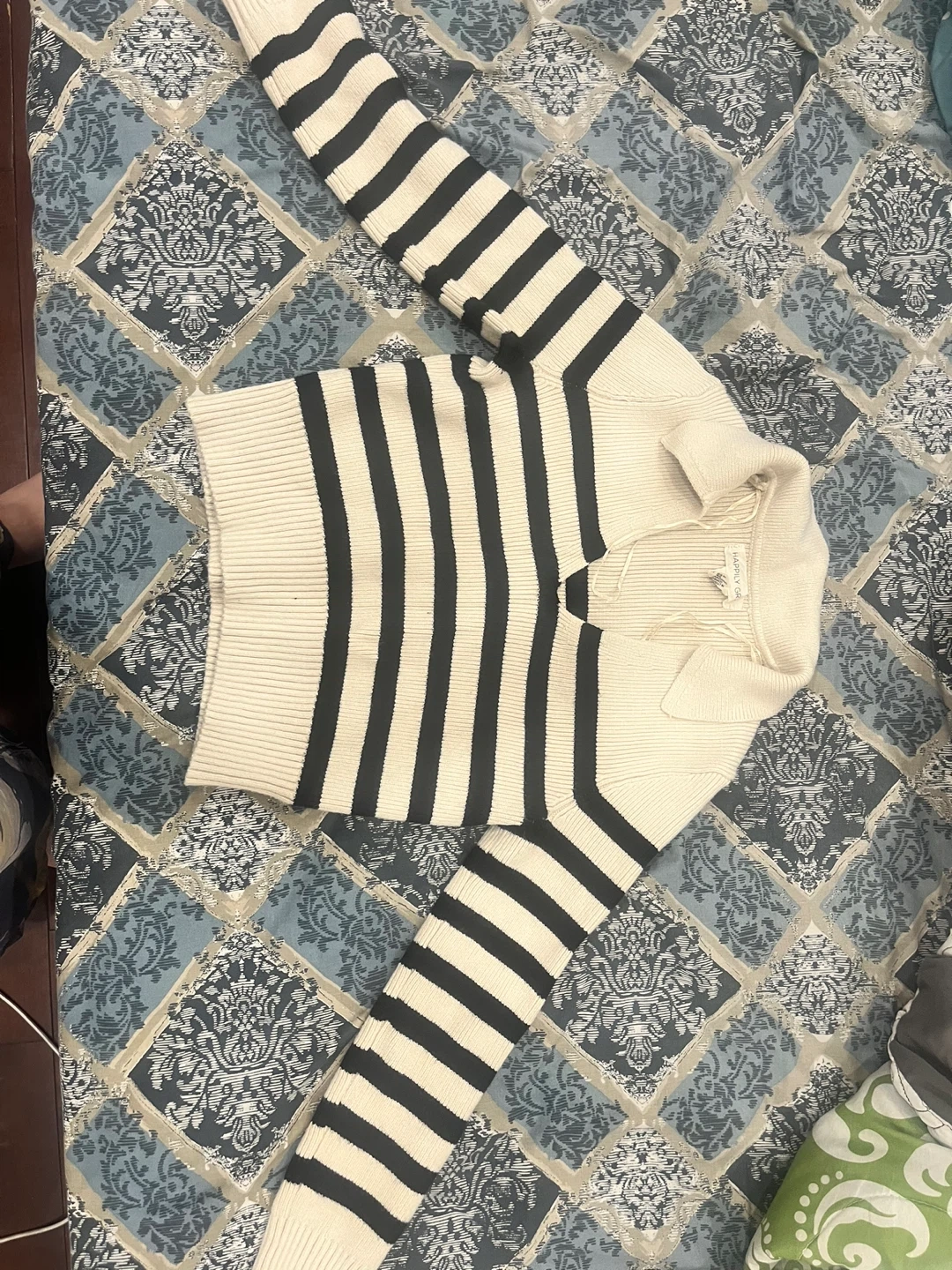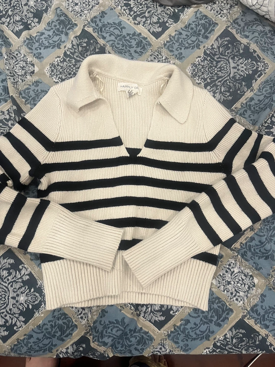 This is a ribbed knit sweater with a collared neckline and a deep V-cut. It features a classic black and white stripe pattern. Ribbed cuffs and hem complete the look.