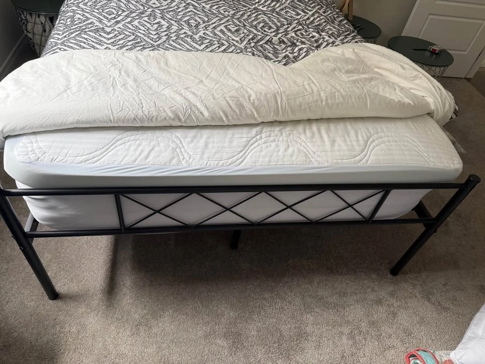 Selling a complete double bed set including a metal frame, mattress, and bedding.