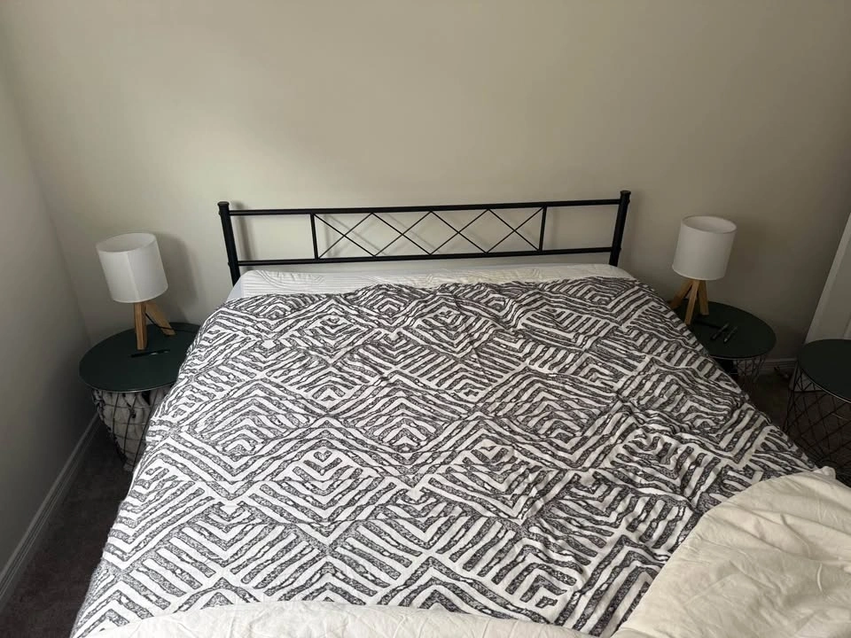 Condition is excellent, from a smoke-free home. Selling because I'm moving. Located in Brantford. Pickup required; the frame can be disassembled for easier transport. The side tables and lamps shown in photos are not included.