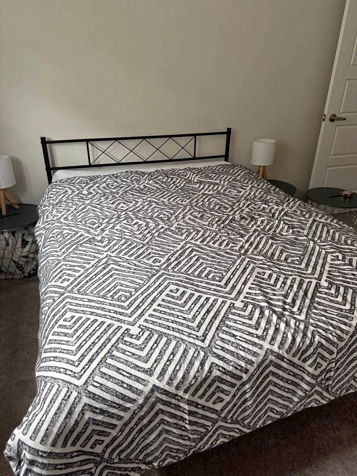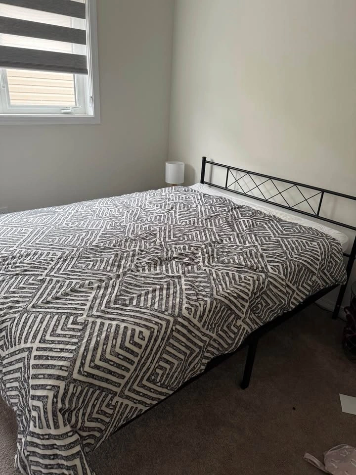 Selling a complete double bed set including a metal frame, mattress, and bedding.