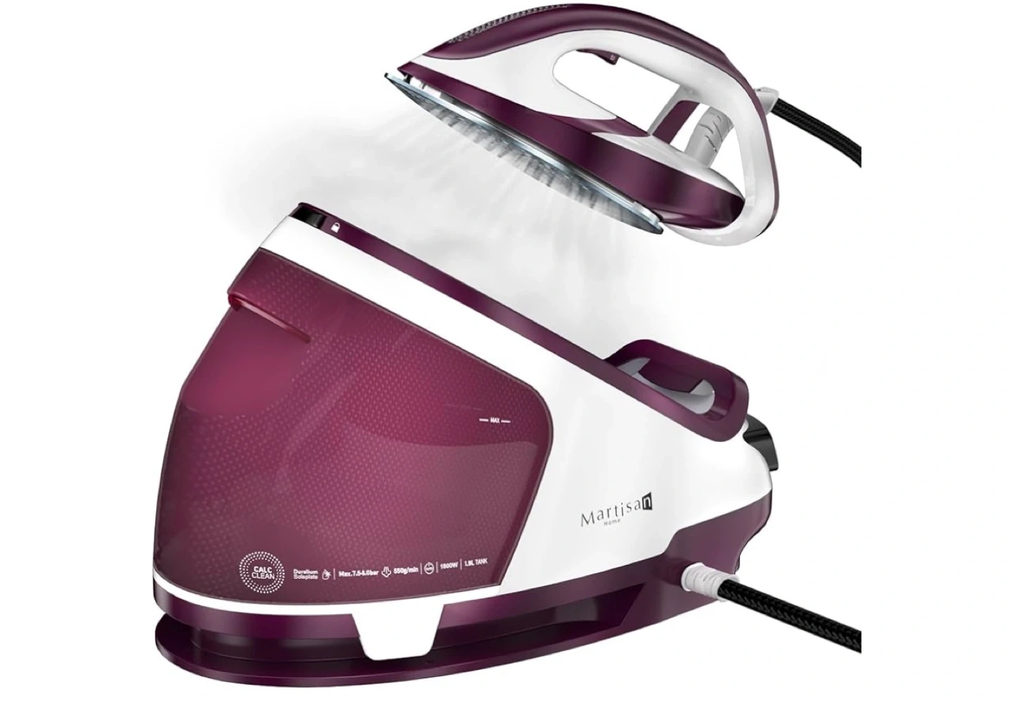 Martisan Home steam generator iron with a large 1.8L tank. Features Calc Clean system, 850g/min steam output, and 1800W power. Includes durable soleplate for efficient ironing.