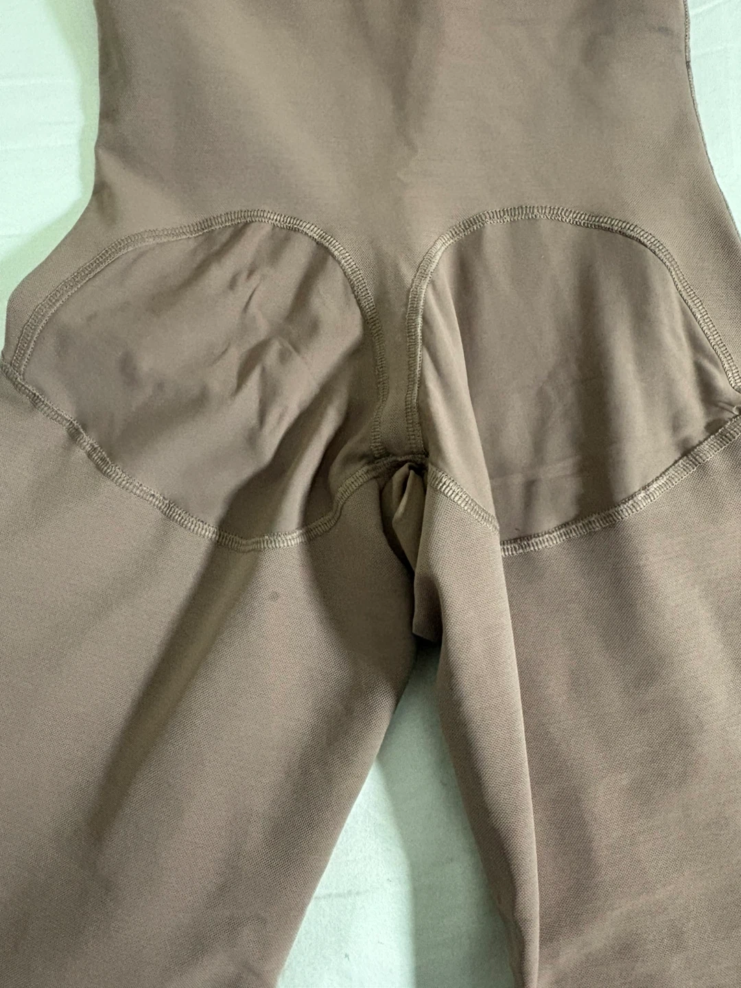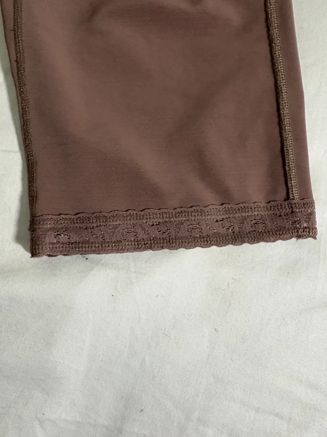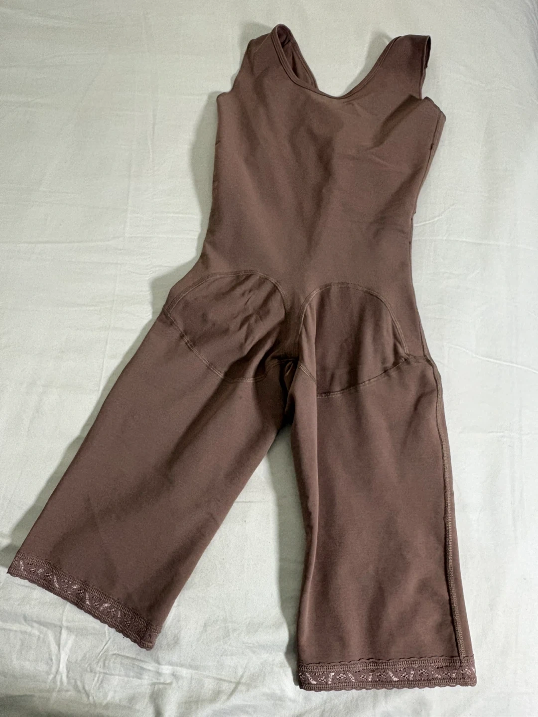 This compression bodysuit offers full body shaping with a hook-and-eye closure and a side zipper. It features adjustable straps and a seamless design for a smooth look under clothing. The leg openings have a delicate lace trim.