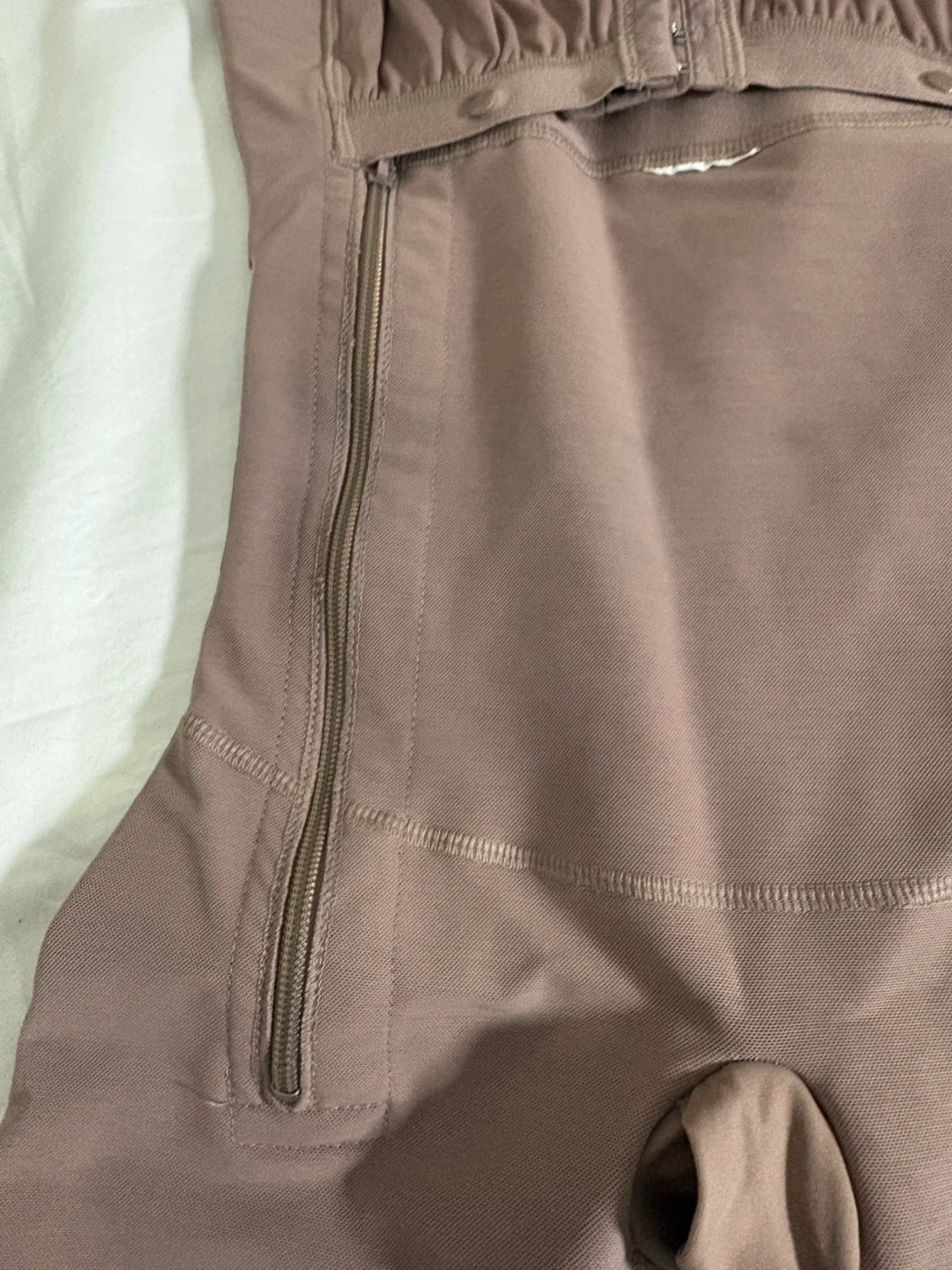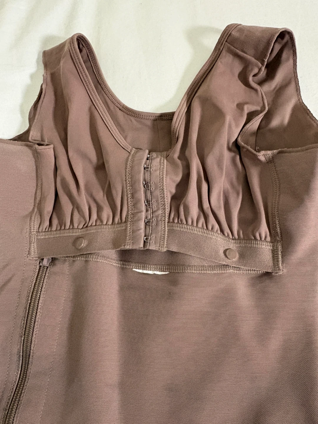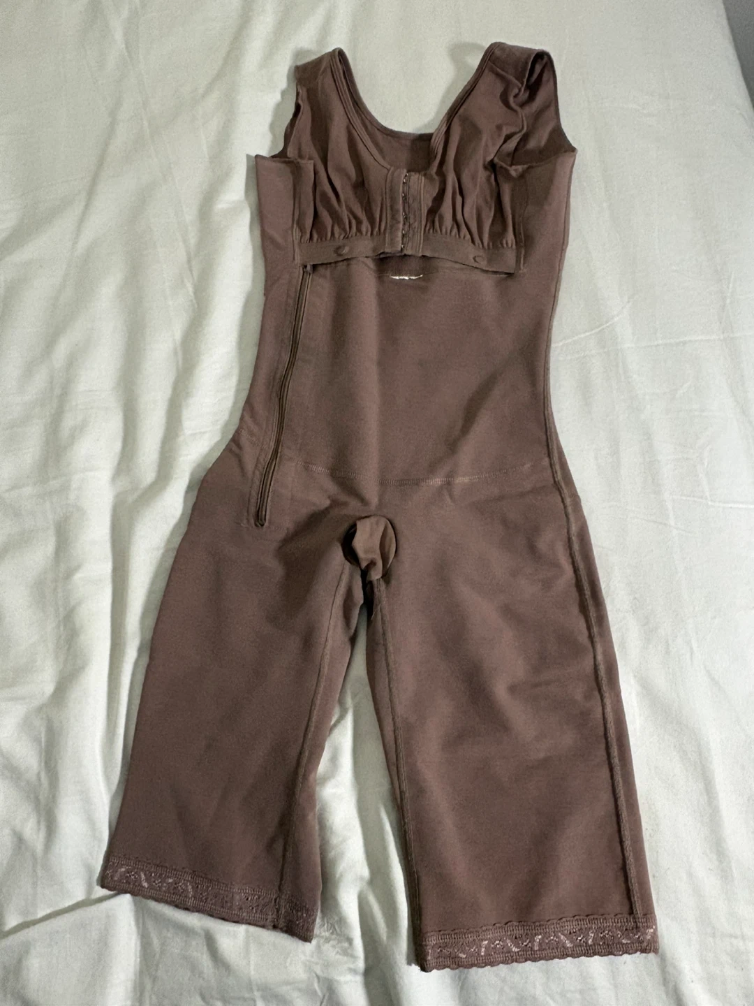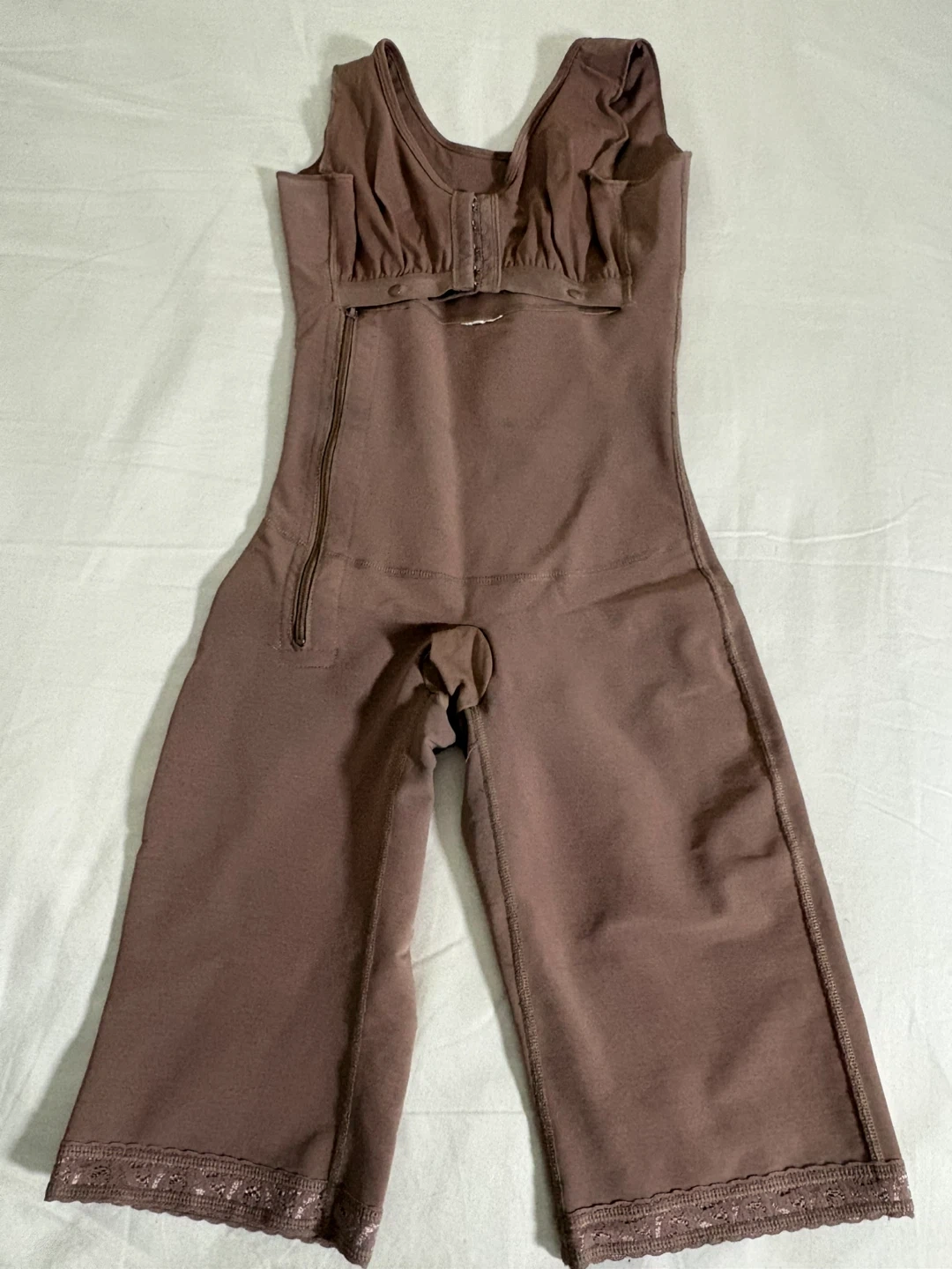 This compression bodysuit offers full body shaping with a hook-and-eye closure and a side zipper. It features adjustable straps and a seamless design for a smooth look under clothing. The leg openings have a delicate lace trim.