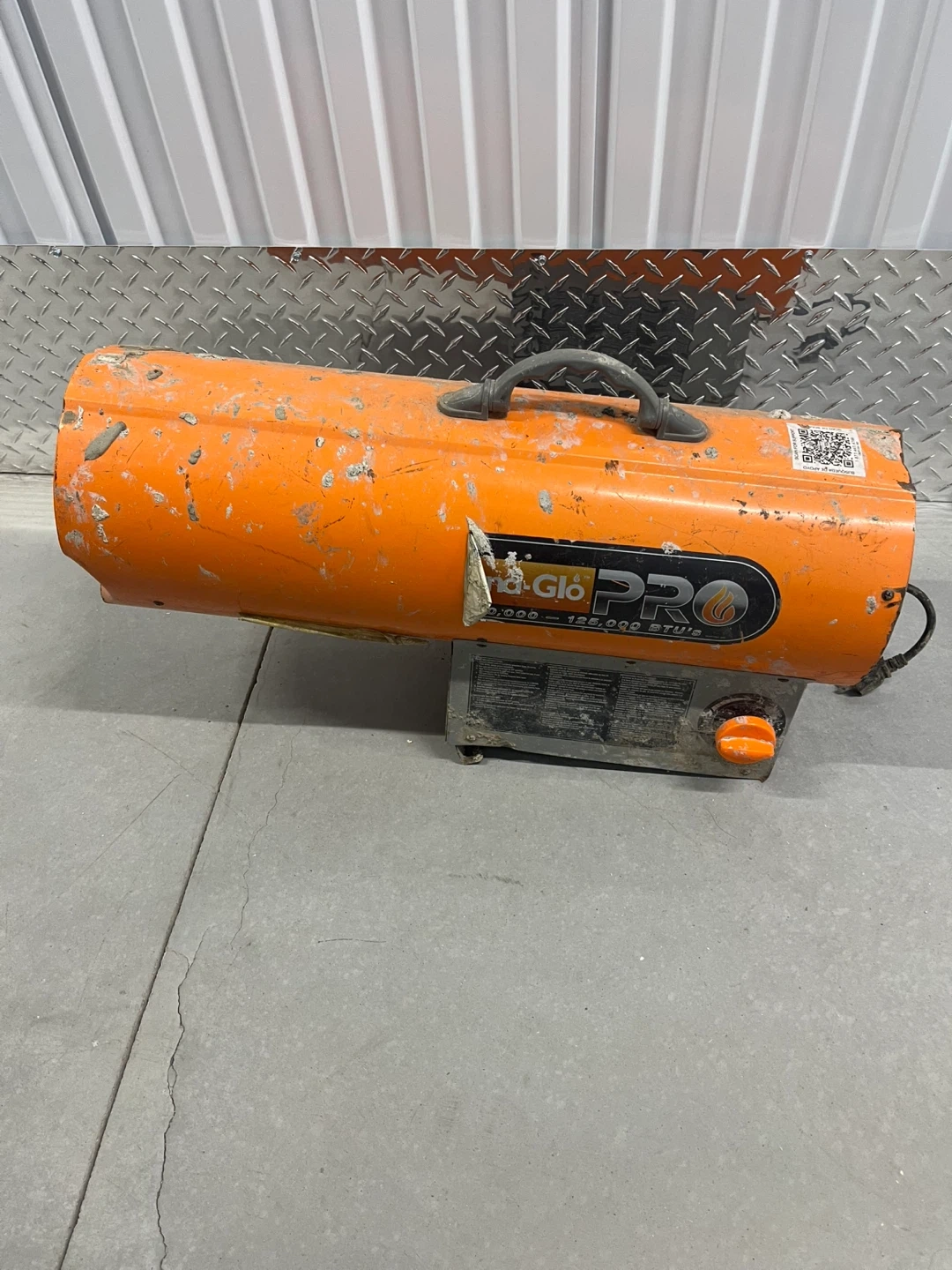 This Dyna-Glo Pro heater offers adjustable heat output from 70,000 to 125,000 BTUs. It's a portable unit designed for various heating needs. It includes a carrying handle for easier transport.
